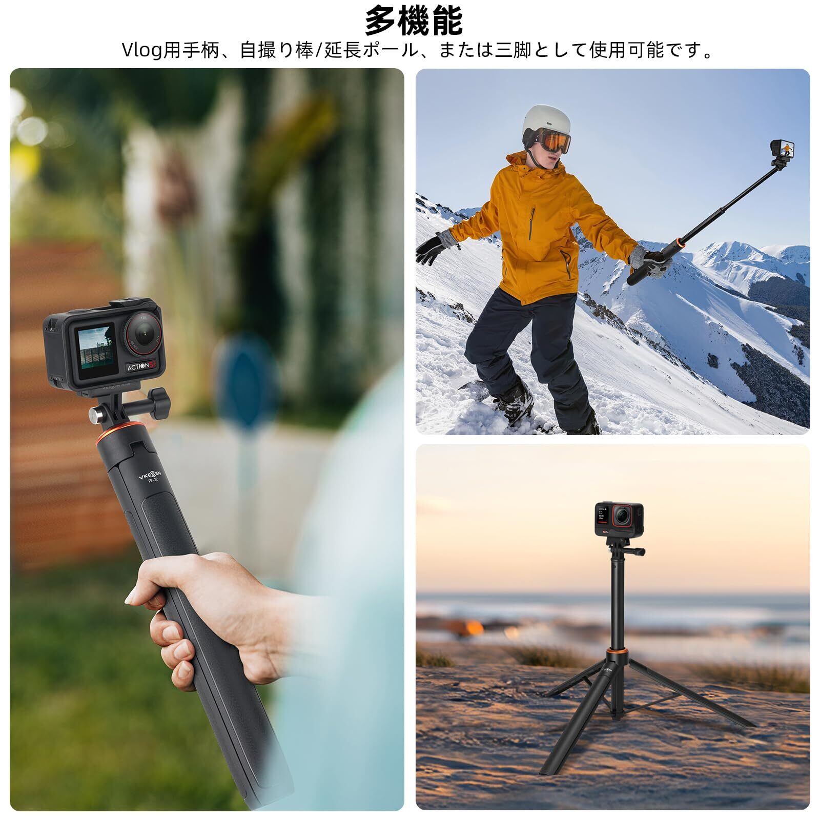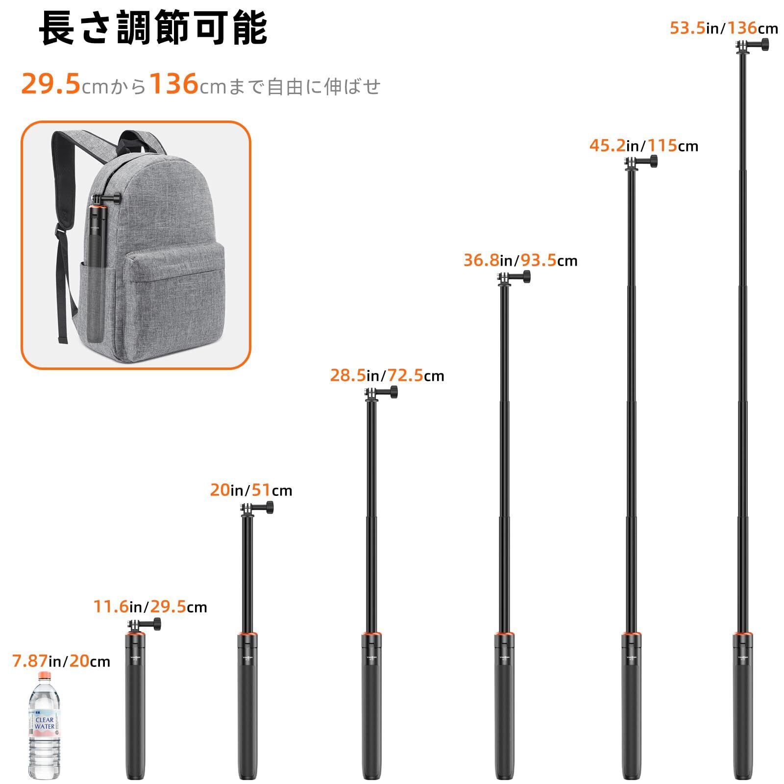 DJI Osmo Pocket 3用 三脚/自撮り棒/一脚兼用 136cm延長ポール/セルカ棒 6段伸縮 長さ調整可能 持ち運び便利 軽量 折りたたみ 旅行用 vlog アクセサリー GoPro Hero 13/12/11/10/9, Osmo Action 5 Pro/4, Insta 360 X4/X3/Ace Pro, AKASO EK7000 Pro 等に対応