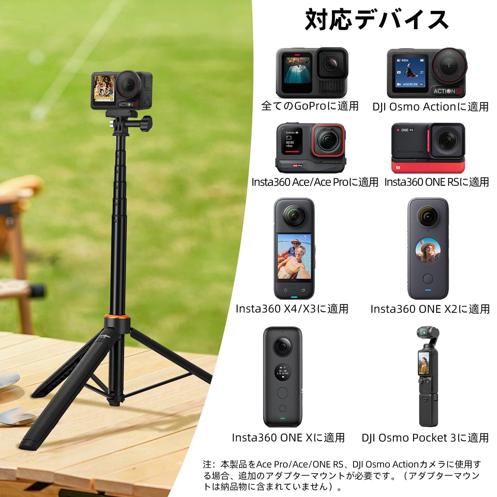 【多機種対応】gopro用三脚は、ほとんどのアクションカメラと互換性があります。GoPro Hero 3/12/11/10/9/8/7/6/5/4/3/3+/Max, DJI Osmo Action 5 Pro/4/3, Insta360 Ace/Ace Pro/Ace Pro 2/ONE RSなどのアクションカメラに対応します。
