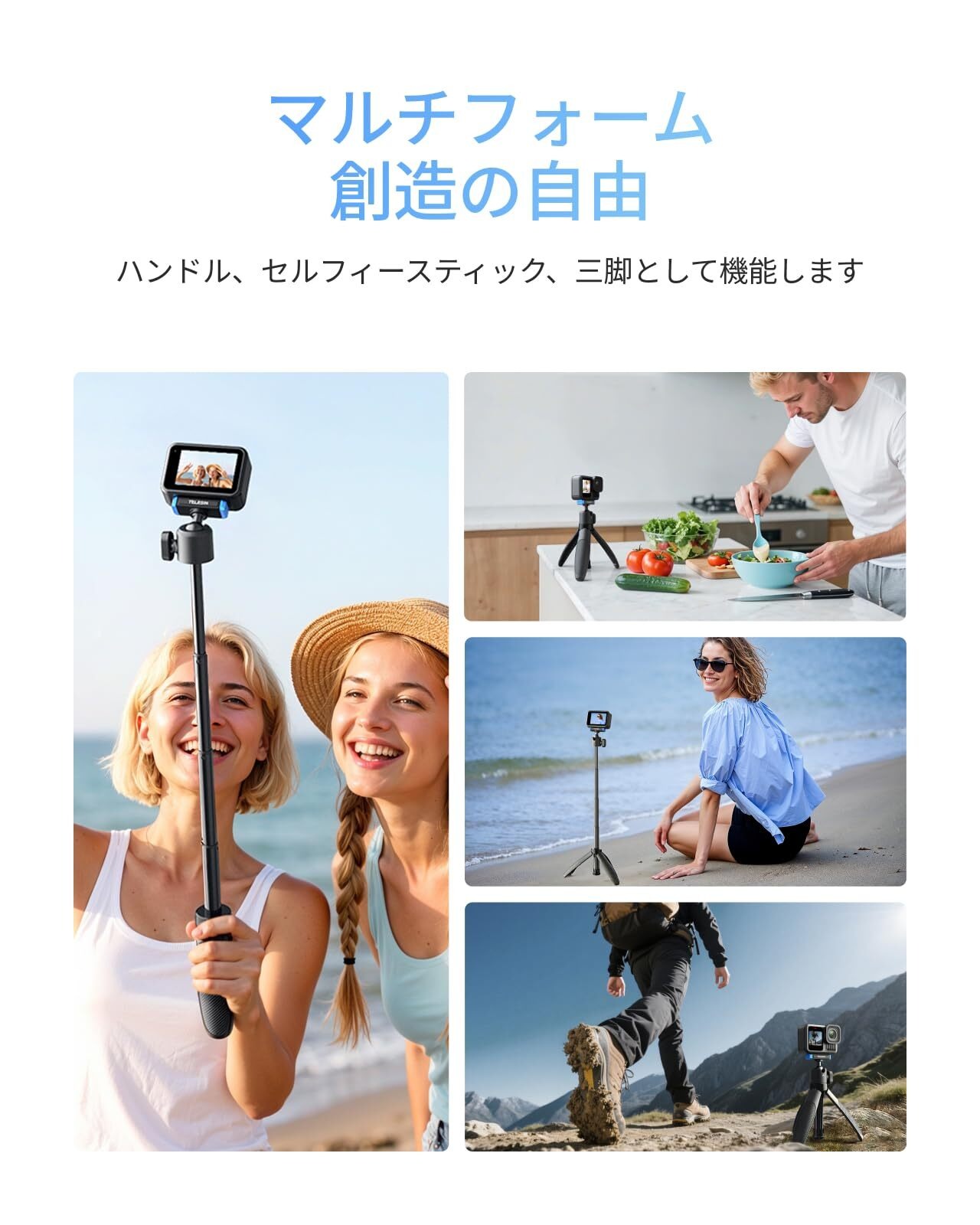 【多様な撮影モード】 ハンドル、セルフィー棒、三脚の機能を兼ね備えています。ハンドルモードはスポーツ追跡撮影に最適、セルフィー棒モードは広角撮影を容易に、三脚モードはデバイスを安定して支え、タイムラプス撮影や固定カメラ位置撮影などに役立ちます。1つの製品で複数の機能を実現し、アクセサリーの持ち運び負担を軽減。家族集まり、アウトドア撮影、日常の記録など、多様な創作ニーズに対応し、より多くの撮影アイデアを解放します。