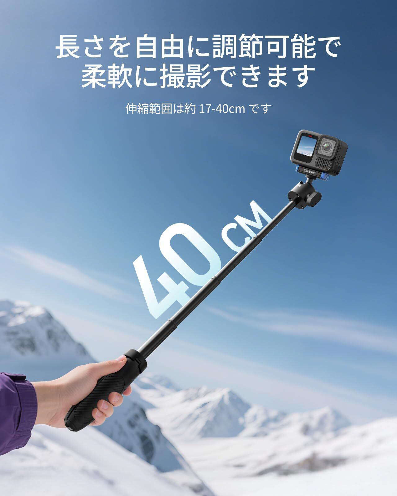 ■【多機能なデザインで自由な撮影を!】TELESINの三脚はGoPro Hero 13専用に設計されており、自撮り棒としても使用できる多才なアイテムです。44cmまで伸びる延長ポールを搭載しており、さまざまなシーンで最適なアングルを実現します!
