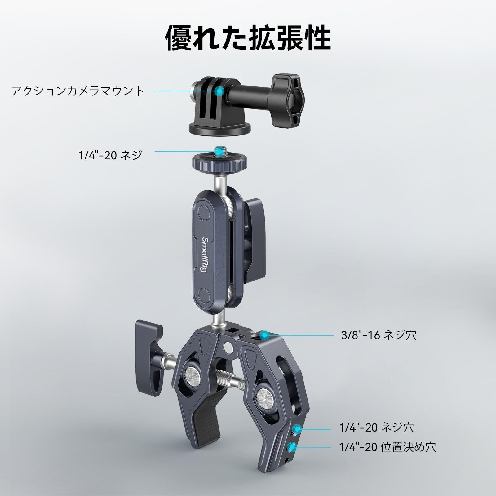 【幅広い互換性】スーパークランプには1/4"-20のネジ穴と3/8"-16のネジ穴があり、アクションカメラ、モニター、LEDライト、マイクを素早く接続できます。