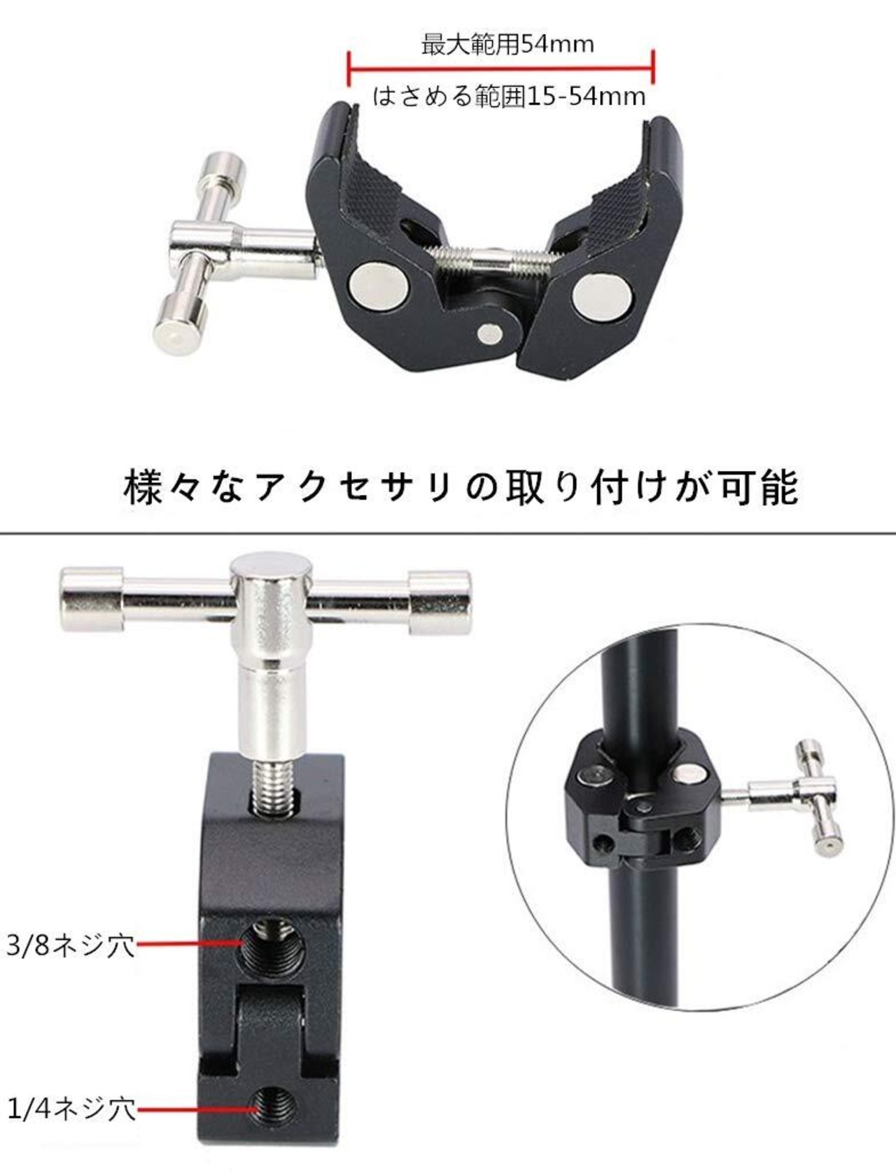■【多機能なクランプ!】YFFSFDCのスーパークランプは、15-54mmのパイプに対応しており、さまざまな撮影環境に適応します。1/4インチネジ穴と3/8インチネジ穴が搭載されており、カメラやアクセサリーをしっかりと固定できます。