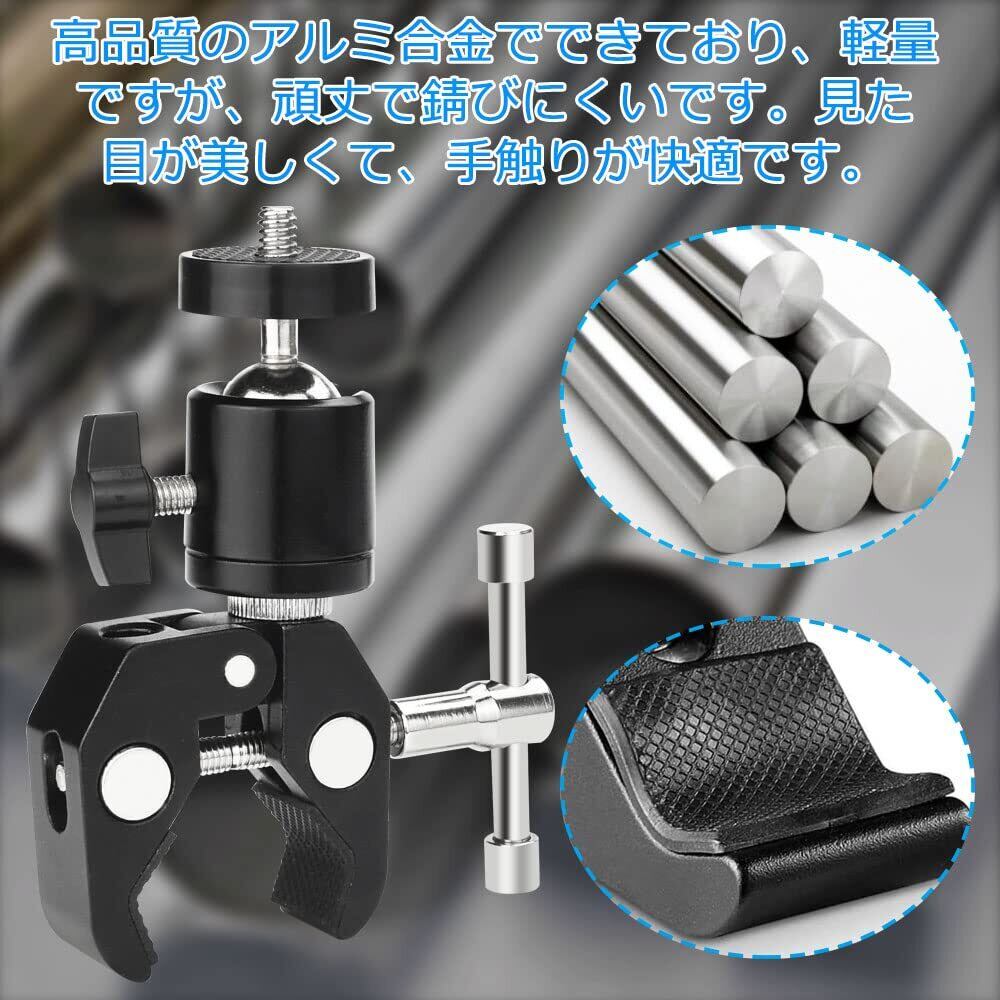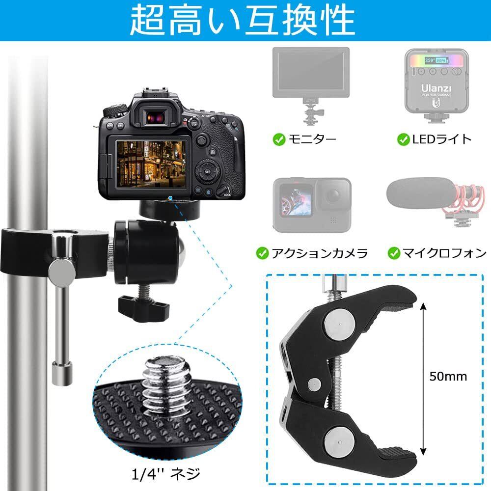 【多機能スーパークランプ】カメラマウント、LEDライト、小型な液晶スクリーンなど様々な撮影機材と組み合わせて使えます。写真撮影に欠かせないツールです。また、さまざまなクロスバー、ブラケット、テーブル、手すりなどに固定できます。