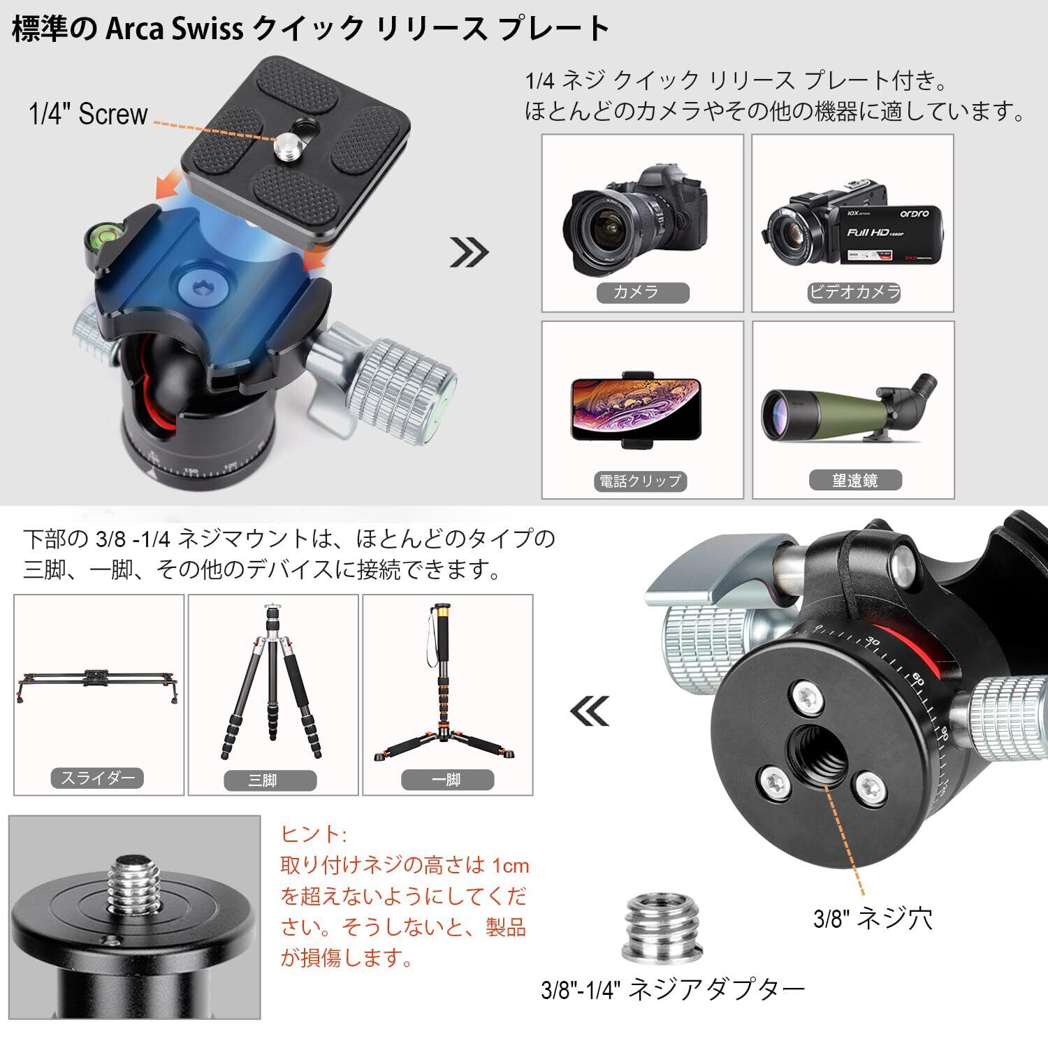 【アルカスイス規格ボール雲台】:アルカスイス標準なクイックリリースプレートに互換性があります。クイックシューはカメラ守るゴムが貼り付けて、脱落防止のネジがあり、迅速に調節できます。