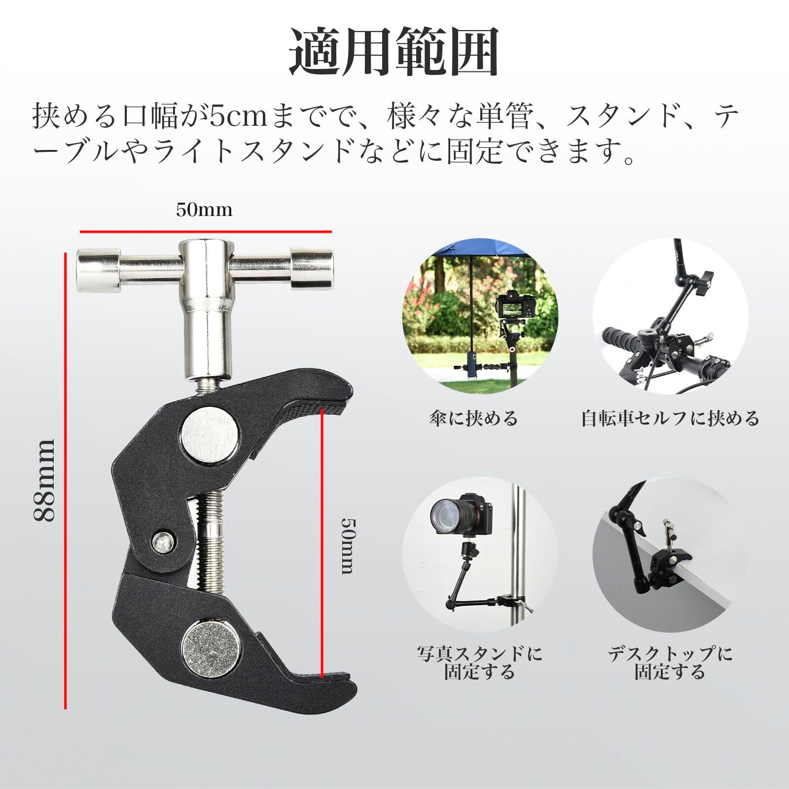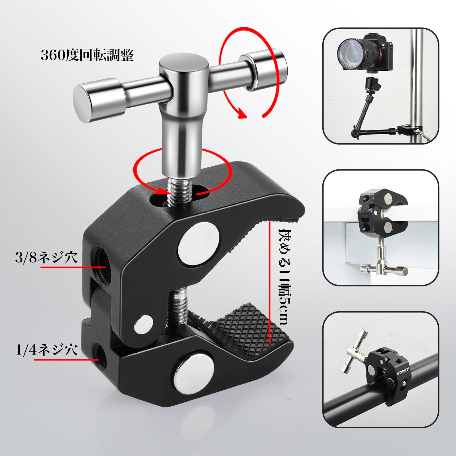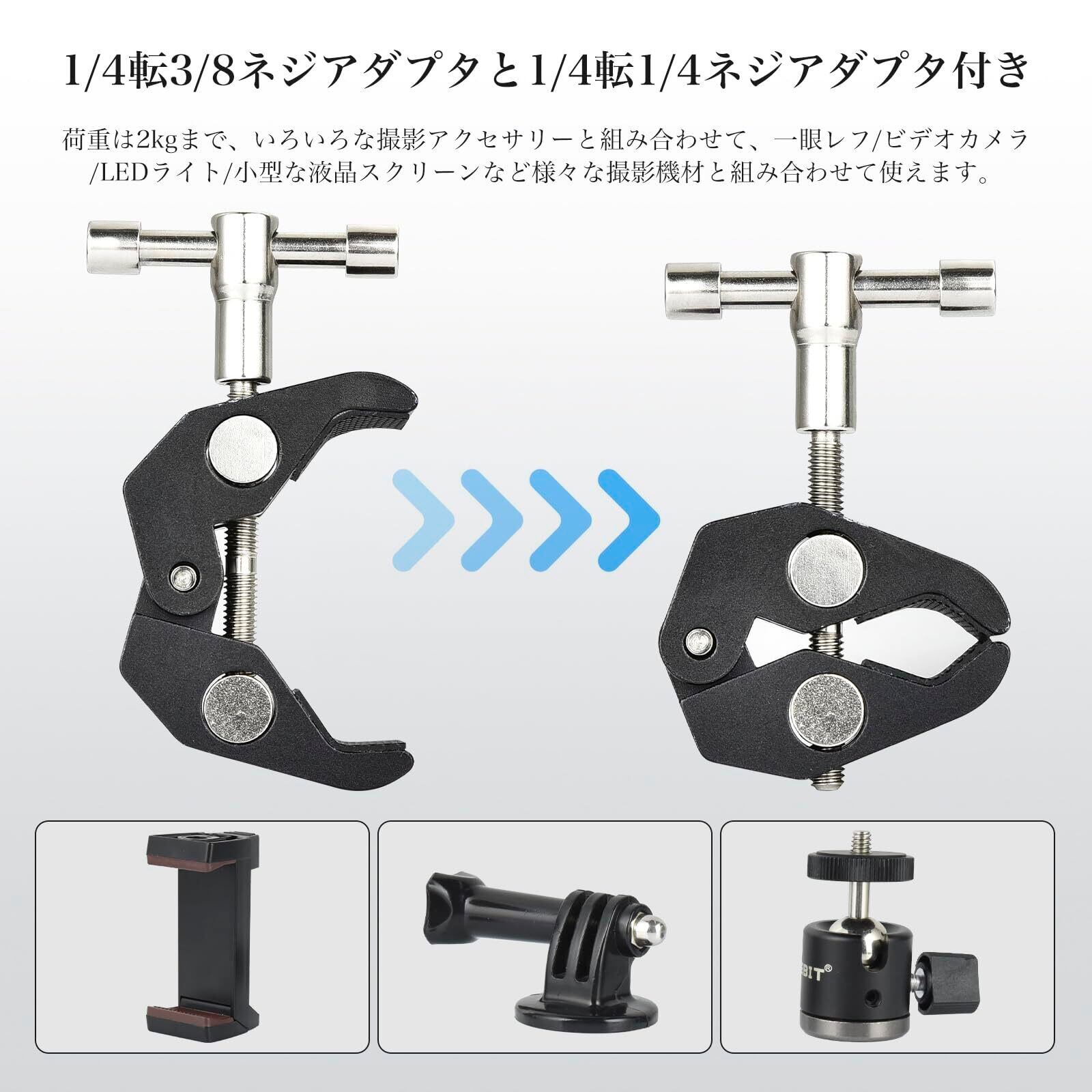 【豊富な撮影アダプター】c型クランプの荷重は2kgまで、1/4転3/8ネジアダプタ、1/4転1/4ネジアダプタが付き、いろいろな撮影アクセサリーと組み合わせて、一眼レフ/ビデオカメラ/LEDライト/小型な液晶スクリーンなど様々な撮影機材と組み合わせて使えます。