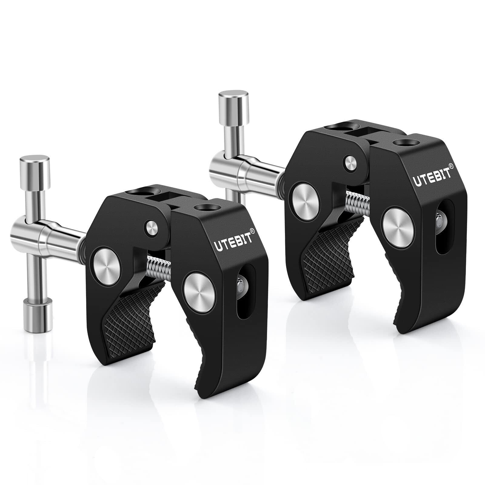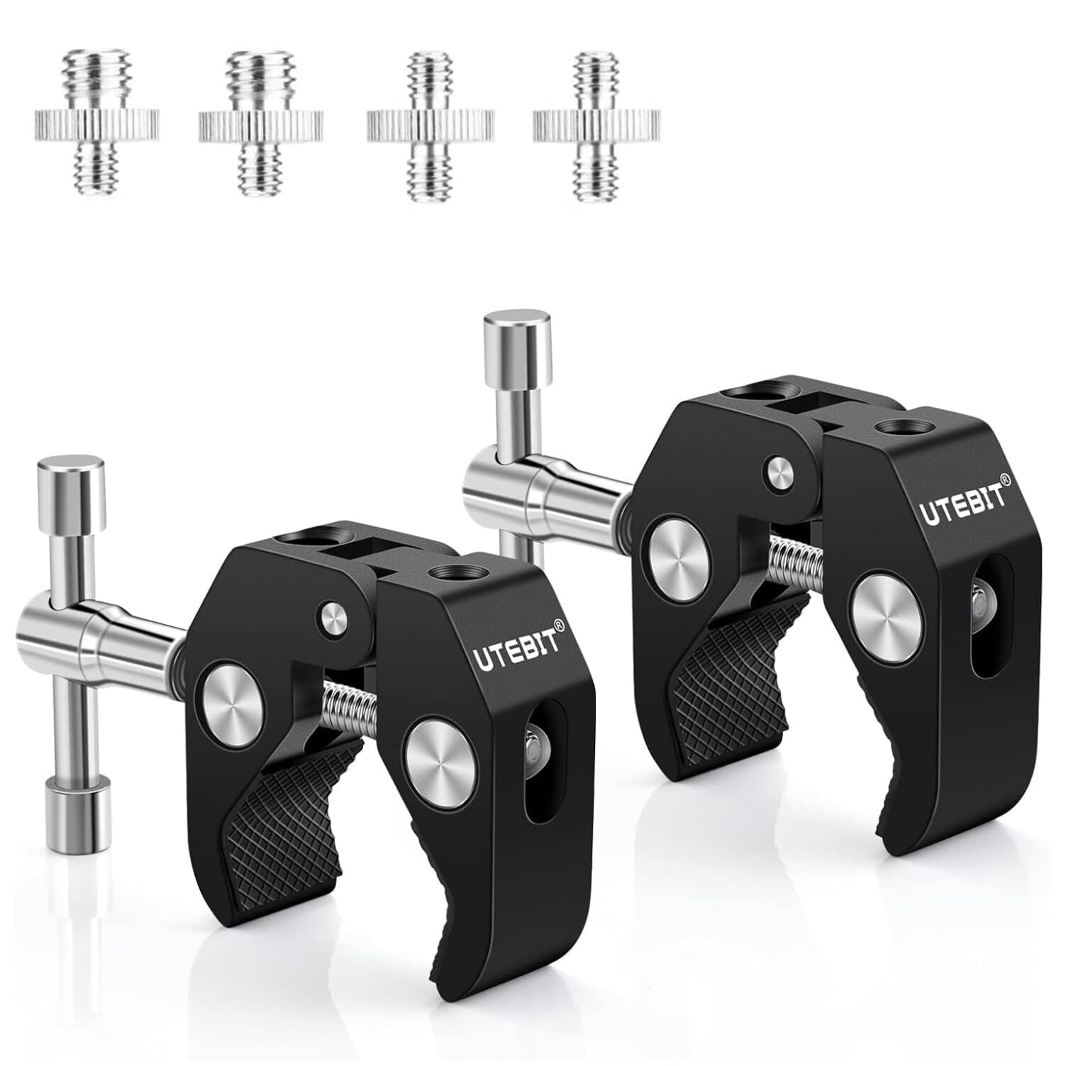 UTEBIT カメラ クランプ 2点セット 雲台 クランプ 耐荷重2kg 1/4'' 3/8'' ネジ変換アダプタ付き cクランプ カメラ スーパークランプ 60mm径パイプクランプ 蟹バサミクランプ カメラ クランプ アーム アルミ合金製 360度回転可 緩み防止 雲台 撮影 照明機材 固定