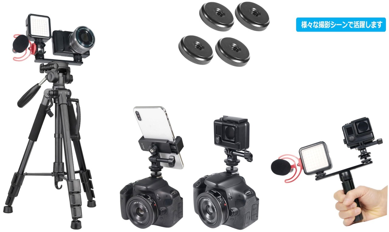 【様々なシーンで活躍】カメラやスマホで写真や動画、・ビデオ撮影、Youtube、SNSなど動画視聴・鑑賞、テレビ電話・オンラインミーティング、Vlog、タイムラプス撮影、会議の録画、リモートワーク・テレワーク、ビジネスやフリマ出品などの商品撮影、 旅行・トラベルでの記念撮影や風景撮影、 などの様々なシーンで活躍します。三脚 ベース・角度調整雲台・トライポッドアダプター クイックリリース マウントアダプター、プレートアダプター、シュー クランプ ホルダー、コールドシュー用ブラケット、 水平・垂直マウントL字型プレート、アルカスイス (互換)プレート、三軸ジンバル スタビライザー 拡張アダプター、カメラ用リストストラップのストラップ用アダプター、DSLR 一眼レフカメラ・SLR ミラーレスカメラ、ウェアラブルカメラ、ビデオカメラやLEDライト・照明、マイク、音響機器、カメラ機材の組み替え、マウント補強、等、撮影シーンにおいて幅広く対応します。