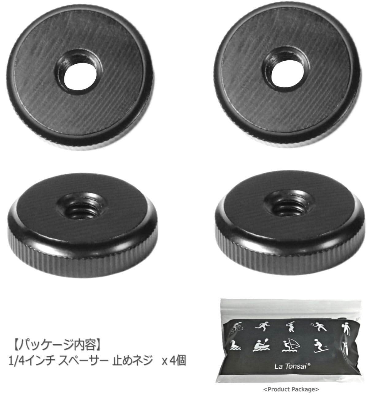 【製品概要】ネジ穴φ:1/4インチ( 1/4"-20 )、 ネジ直径:24㎜、 厚み:7㎜ 材質:アルミニウム合金 重量:約6.0g/個 カラー:ベーシック ブラック(黒・無地) 入り数;4個