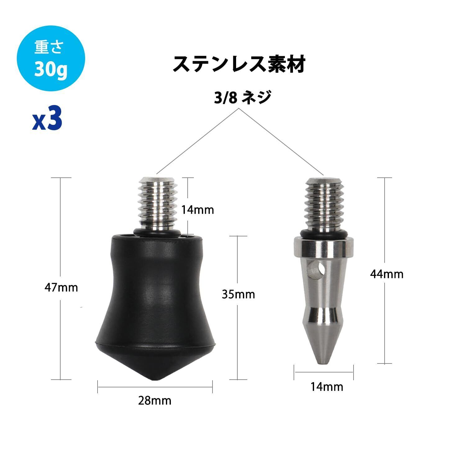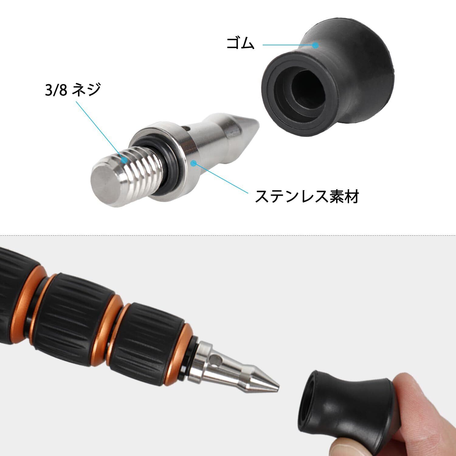 【使いやすい】3/8"-16のねじ穴を通して、三脚と一脚の脚にねじ込むだけです。 金属スパイクの中央に穴があり、L字レンチで簡単にロック・緩められます。 (注意: シリコンラバーカバーはスパイクを三脚に取り付けた後で簡単に取り外すことができます。)