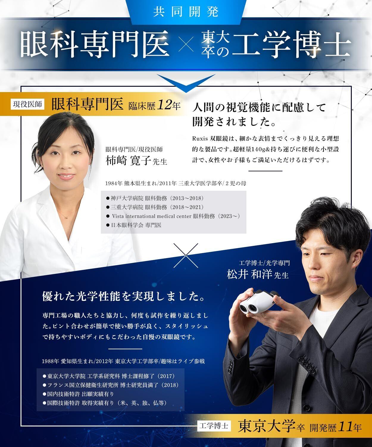 【 眼科医x東大卒の工学博士が開発 】現役医師で眼科専門医の柿崎寛子先生(臨床歴12年)と、東京大学出身で工学博士の松井和洋先生(開発歴11年)が共同開発。現代医学と先端光学の知見を融合し、”驚きの見やすさ”を実現した人気の双眼鏡です。