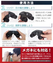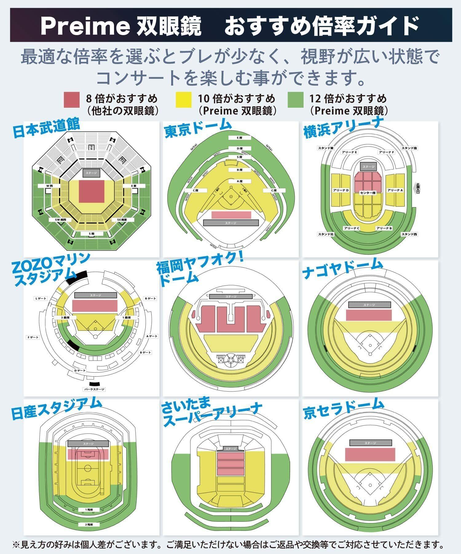 【倍率について】「倍率が高いほどよく見える」という認識は間違いです。適切な倍率はその目的により変わります。特に高すぎる倍率は視野を狭め、視野を暗くするため、コンサートには向かない場合ががございます。以下に各会場でのおすすめの倍率を記載致します。武道館:アリーナ席8倍、スタンド席10倍、東京ドーム:アリーナ席8倍、スタンド席10~12倍、大阪ドーム:アリーナ席8~10倍、スタンド席10倍、札幌ドーム:アリーナ席10倍、スタンド席10~12倍、名古屋ドーム:アリーナ席10倍、スタンド席10~12倍、福岡ドーム:アリーナ席8倍、スタンド席10倍、埼玉スーパーアリーナ:アリーナ席8倍、スタンド席10倍。これらは目安で、皆様の視野により適した倍率が変わる可能性もございますので、ご参考までにお考えください。