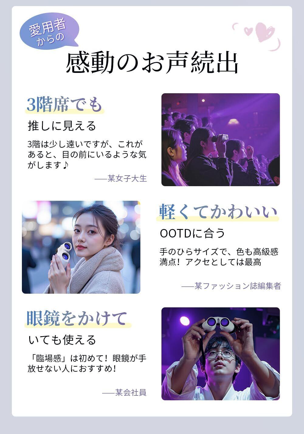 【 高倍率20倍・広視野75度 】双眼鏡 ライブ用は20倍のズームを備えており、ドーム、アリーナ、スタジアムなどの大規模な会場での使用に最適です!高倍率ズーム×75度の超広視野により、遠くの座席からでもステージ上の表情を鮮明かつ広範囲に見ることができ、ライブパフォーマンスの臨場感を一層高めます。また、オペラグラスとしても使用可能で、お気に入りのアイドルのイベントにも最適です。