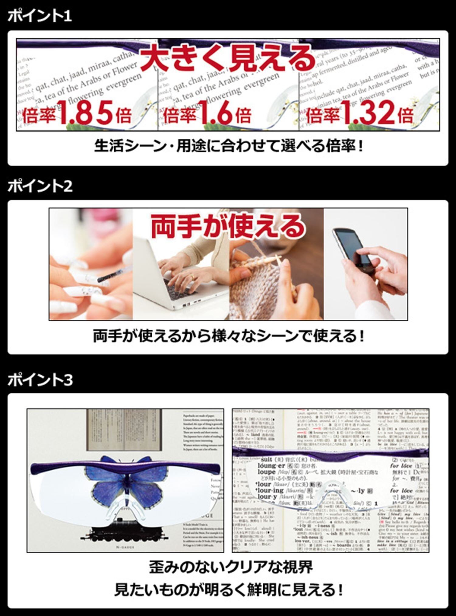 ・1.6倍(お手元での作業: 30cm~40cm): 拡大倍率が高く、読書やネイルケア、手芸、スマホ等手元での細かい作業に適しています。