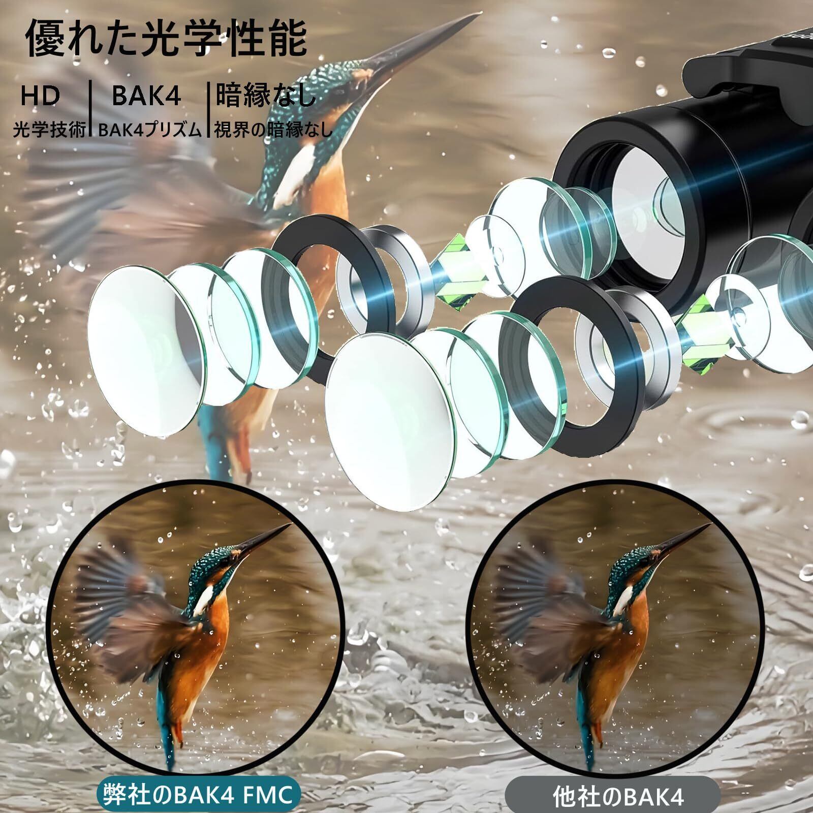 ■【高い透過率と防振設計でクリアな視界!】99.8%の透過率を実現した高性能レンズにより、明るく鮮明な視界を提供。BaK4プリズムとFMCコートが組み合わされており、手ブレを軽減する防振設計が施されていますので、動きのある場面でも安定した映像をお楽しみいただけます。