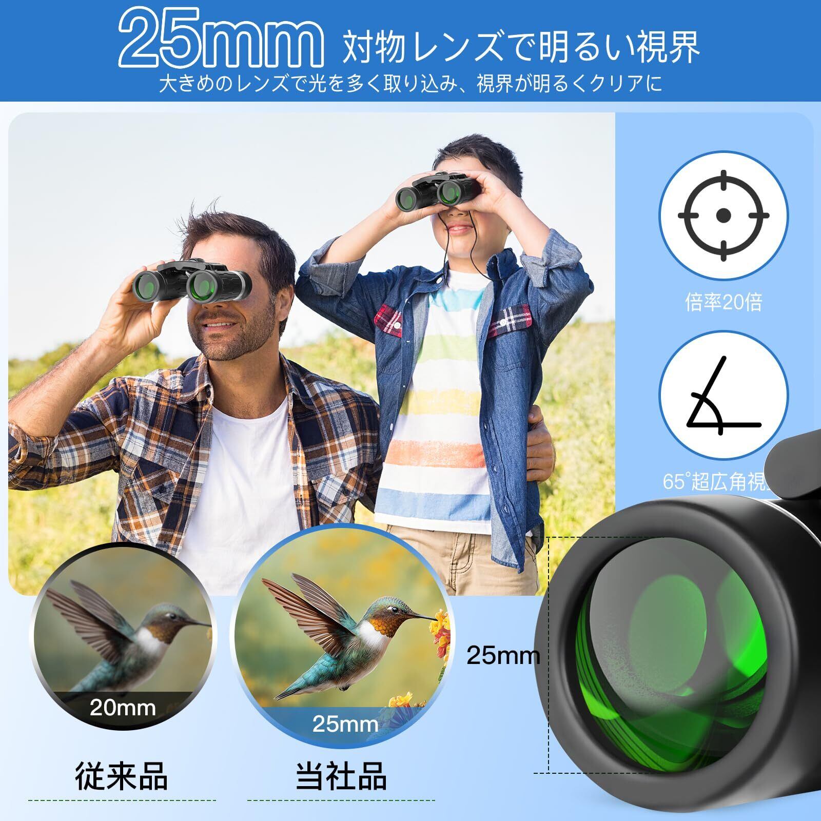 【20倍超高倍率 & 6.5°超広視野】臨場感あふれる視界で感動の瞬間をキャッチ 最新の光学技術により、20倍の高倍率&6.5°の超広角を実現。まるで10m先にいるかのように500m先を鮮明に映し出します。コンサート・スポーツ・野鳥観察など、遠くの細部までクリアに見え、まるでその場にいるかのような臨場感を提供します。
