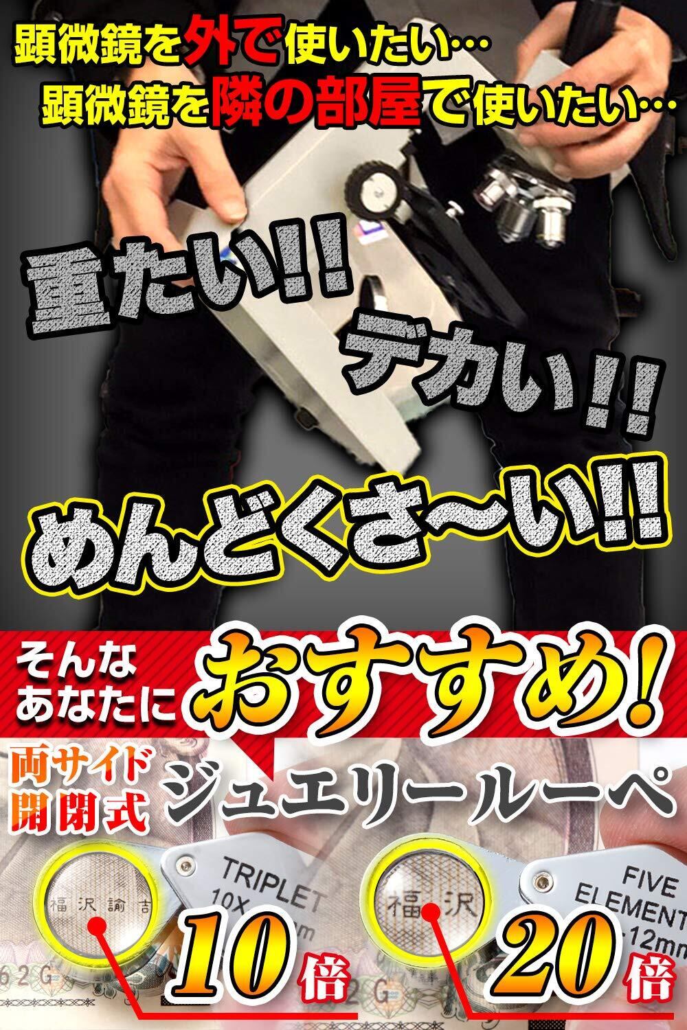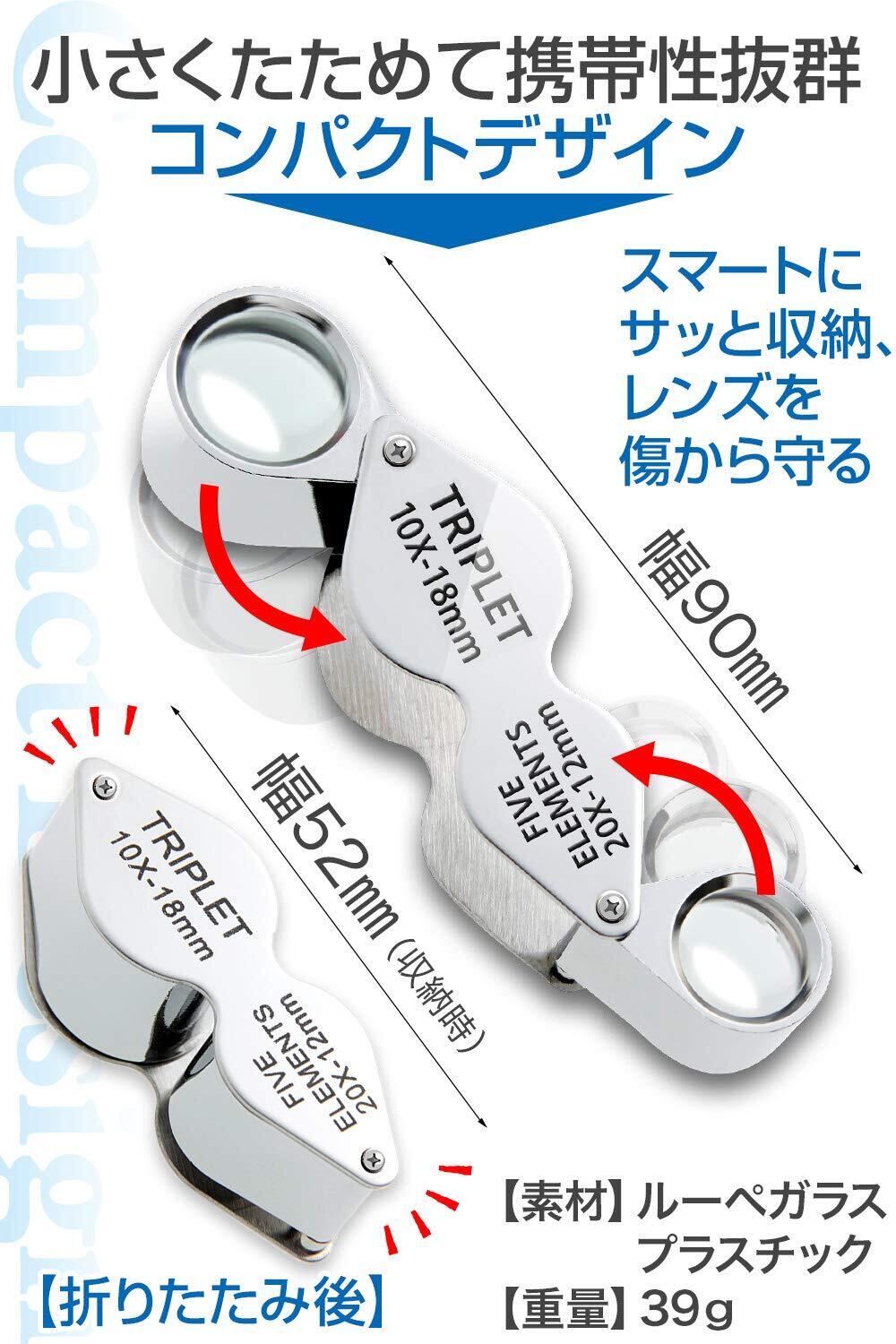 【10倍・20倍の2種類レンズ】折り畳み式携帯用ルーペ拡大鏡です。2枚レンズで倍率20倍、倍率10倍の高倍率!ジュエリー鑑定、コイン、切手、印刷物の校正、校閲などにオススメです。細かい作業などクッキリ・クリアに見えます!