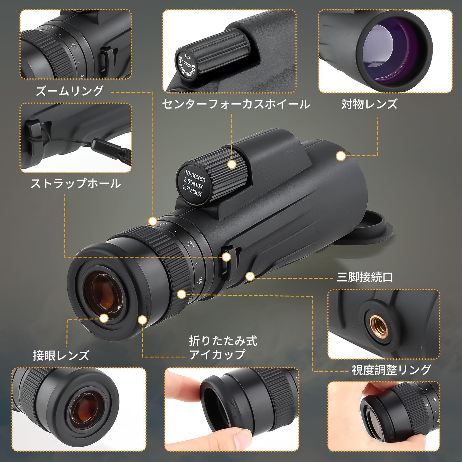 FOCUHUNTER 10-30X50mm 高倍率 単眼鏡 望遠鏡 ポロプリズム式 FMCレンズ 片手操作 手持ちポータブル 窒素防水耐衝撃 コンサート 試合 ハンティング バードウォッチング用 (10-30倍可変倍率 スマホアダプター付と三脚付)