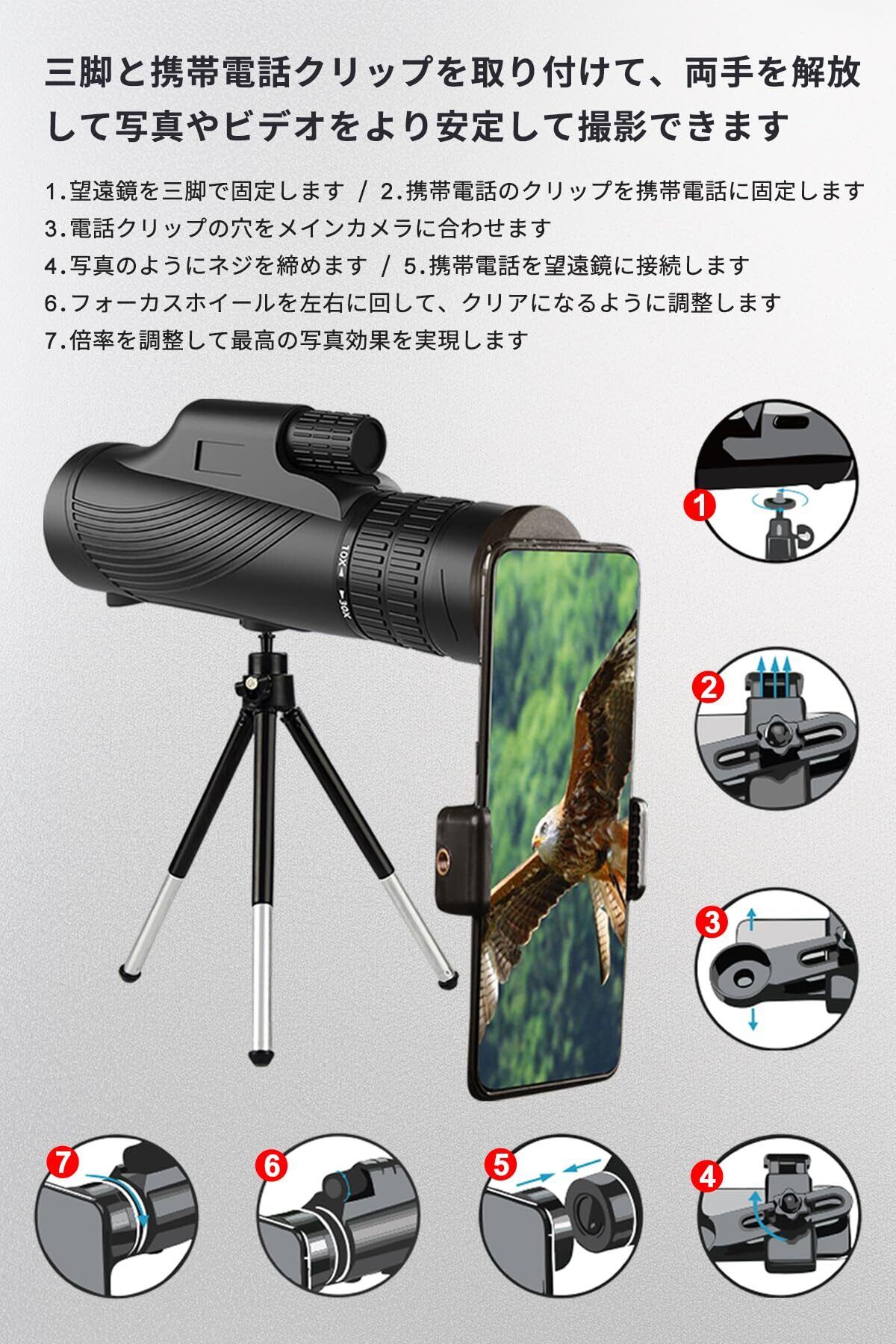 【特別価格】2025最新 SGEBD 単眼鏡 12x50 高倍率 スマホ望遠レンズ 望遠鏡 高倍率 単眼望遠鏡 スマホレンズ 小型 大口径 伸缩三脚 取り付けが簡単 スマートフォン用カメラレンズ 野球観戦/ライブ/コンサート/運動会/旅行iPhone/Android全機種に適用 (黒/10X-30X調整可能)