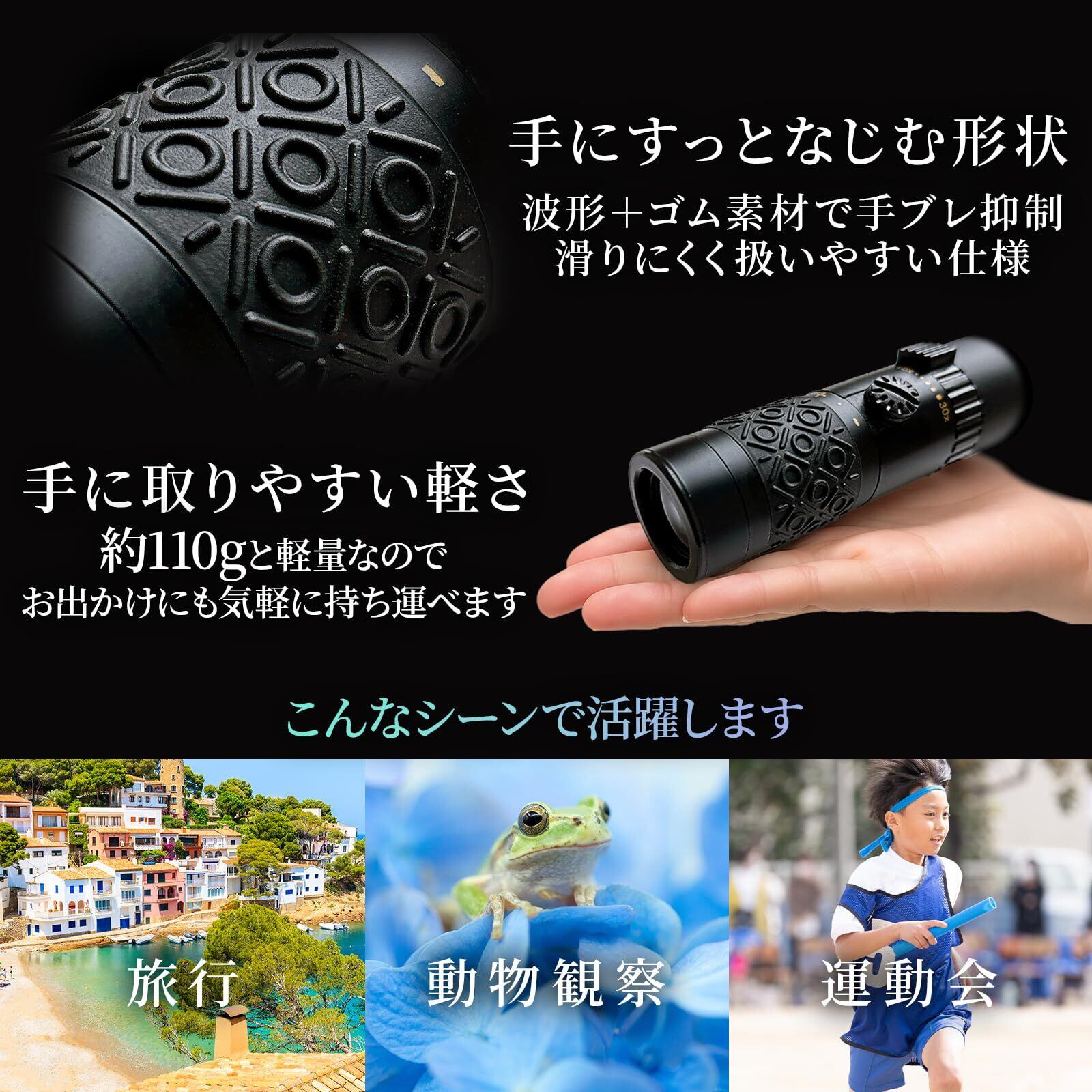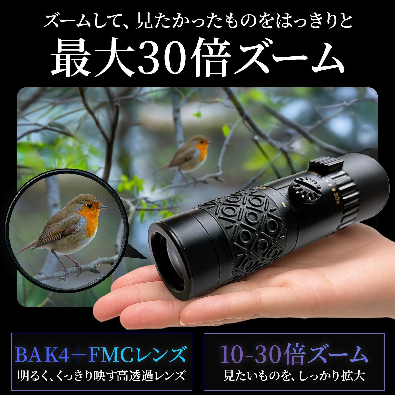 【10-30倍ズーム&高性能レンズ搭載】調整可能な10~30倍ズームとBAK4ポロプリズム、FMCマルチコーティングレンズを採用。光の透過率が高く、夕暮れや曇天時でも明るくクリアな視野を提供します。高解像度で立体的な映像を楽しめます。 【多用途に活躍する単眼鏡】ライブ観賞、登山、野鳥観察、スポーツ観戦、旅行、フィギュアスケート、飛行機観察など幅広く使用可能。メガネの上からでも快適に使える設計で、趣味から日常まであらゆる場面に対応します。 【軽量コンパクト&携帯性抜群】重さはわずか110g。口紅サイズのコンパクト設計で、ポケットやバッグに入れてもかさばりません。付属のストラップや収納ケースで持ち運びや保管も簡単。急なイベントにもすぐに対応できます。