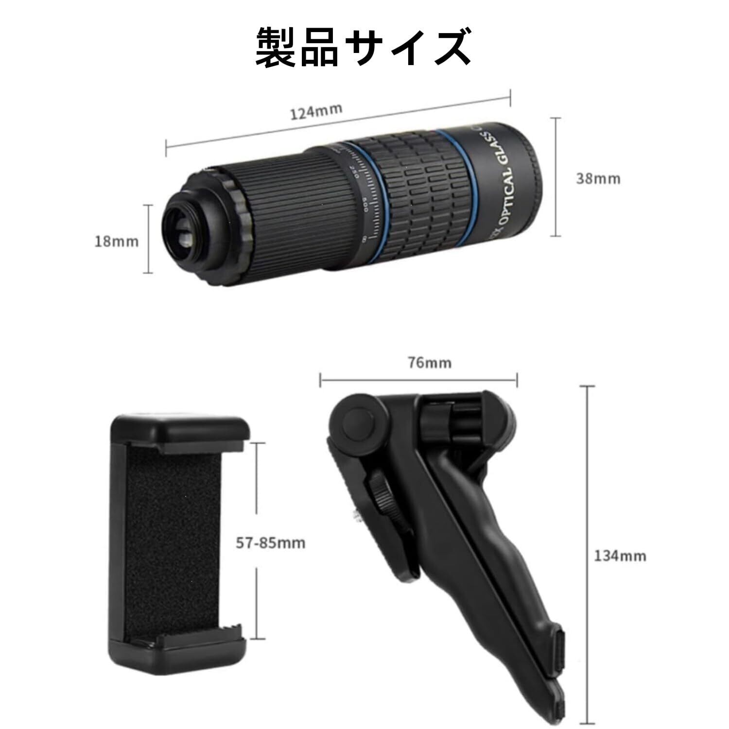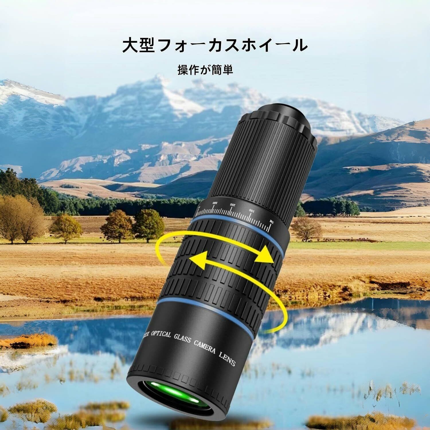 【三つの使用方法、いろんな場面で大活躍】●付属の柔らかく大き目アイカップを付けて単眼鏡として使用します。●付属のクリップに挿し込んでスマホに装着して、望遠レンズとして使用します。ご注意:機種によってはケラレが写る場合がありますが、スマホで少しズームすれば解消することができます。●付属の三脚に装着して、固定撮影に使用します。三脚を使えばブレずに写真を撮ることができます。