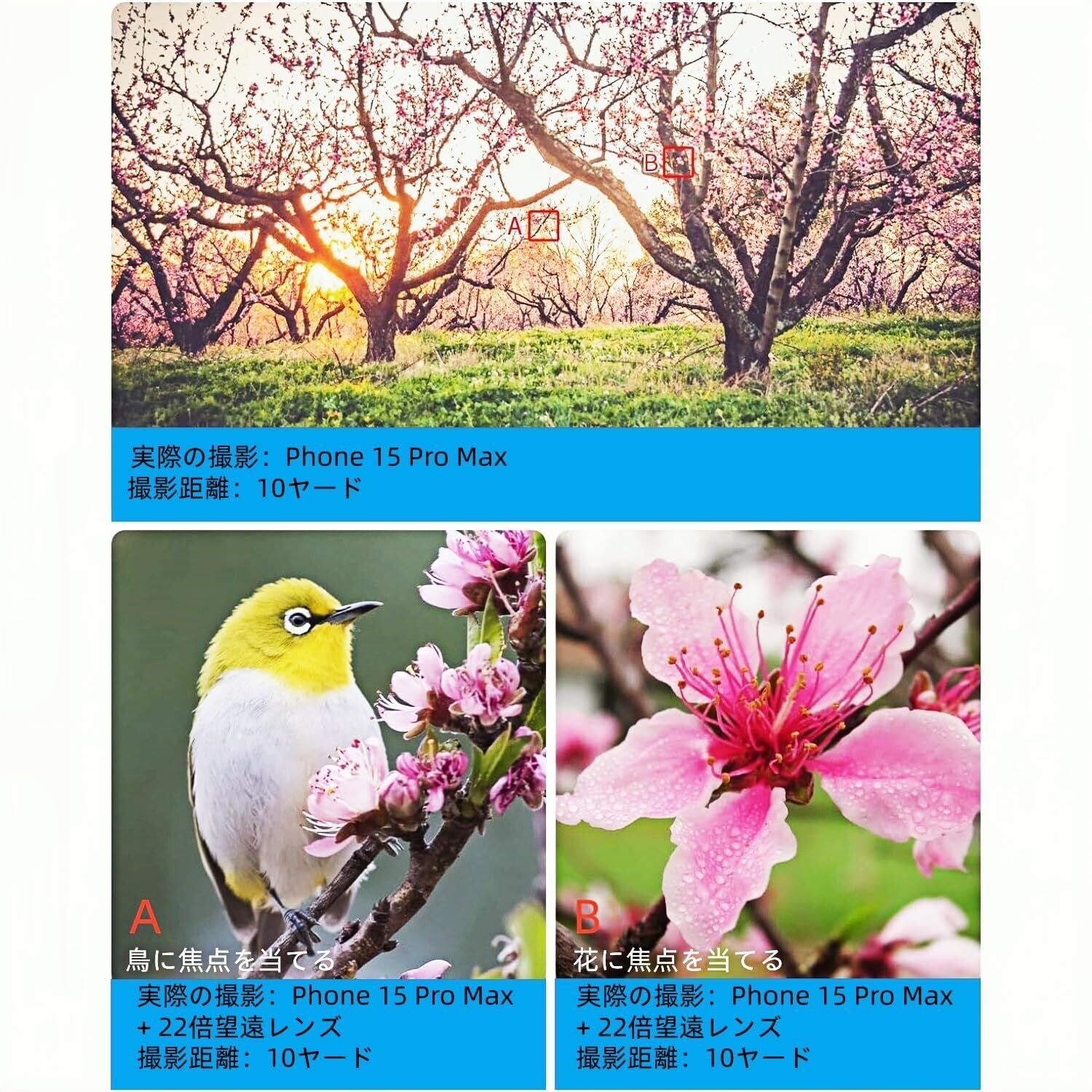 【クリアで鮮明な写真撮れる】●高級プリズムBAK4を採用して屈折率が高く、映像の周辺まで歪みなくクリアに見えます。●25mm大物鏡がより多くな光がレンズに取り込んで鮮明でシャープな写真が入手します。●FMC7層緑膜が普通の緑膜より解像度があがり、クリアで広い視界になります。スマホのデジタルズームで撮った写真がボケますが、スマホ望遠レズ使用してクリアで鮮明な写真が撮れます。