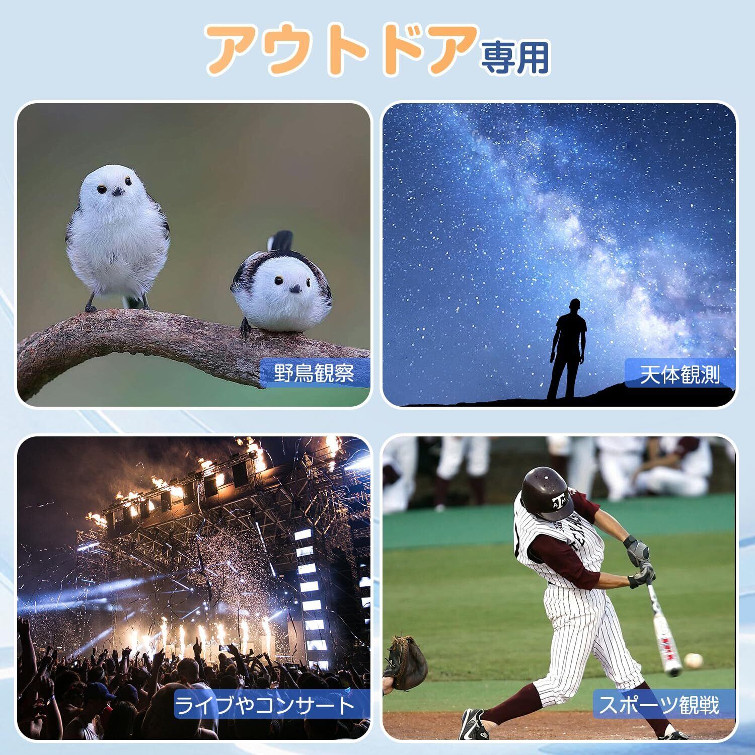 ■【多様なシーンに対応可能な優れたアイテム!】この双眼鏡は、生活防水設計になっており、雪や雨が降る環境でも安心して使用できます。コンサート、ライブ、スポーツ観戦、天体観測、野鳥観察など、様々なシーンで活躍し、特別な瞬間をサポートします。