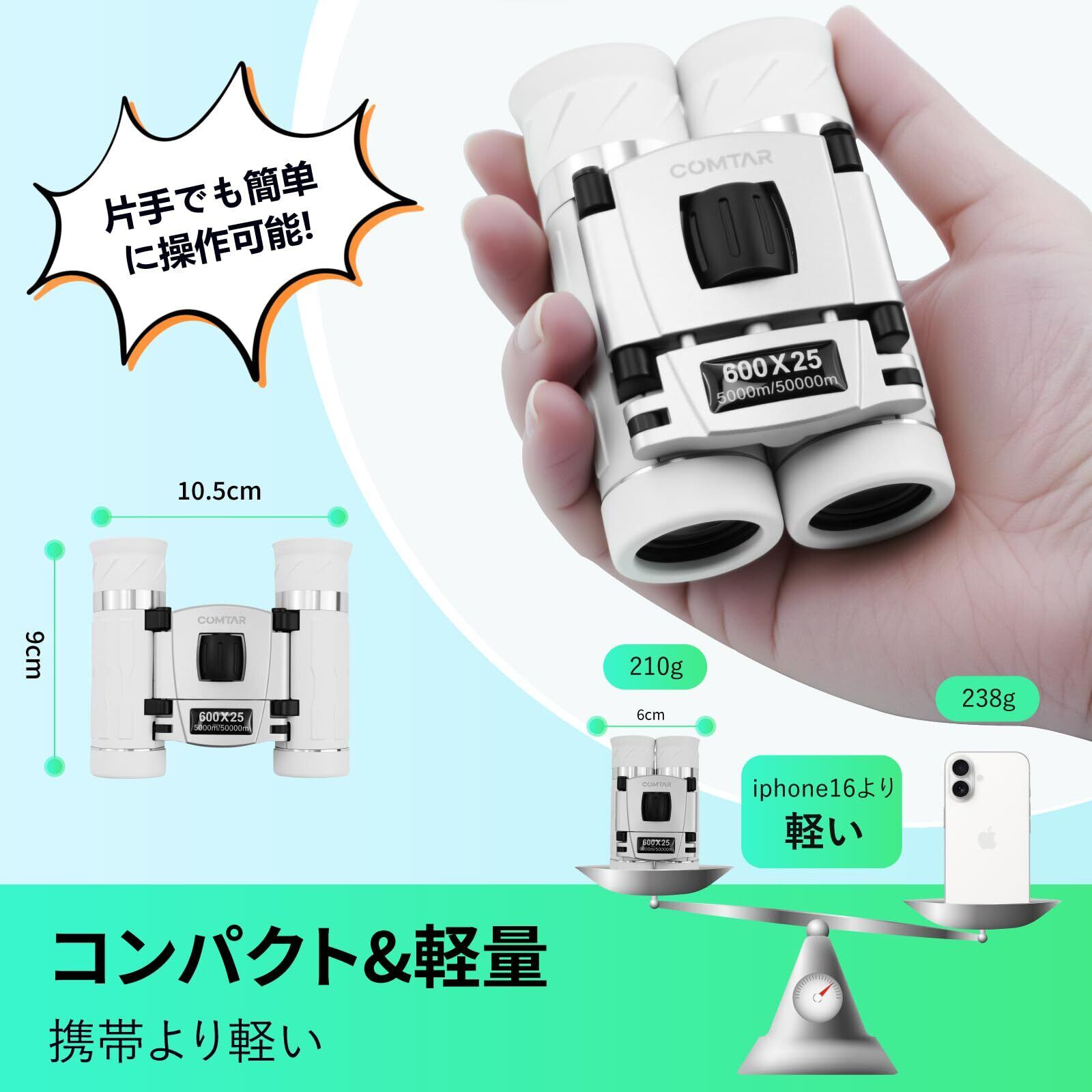 【超軽量&コンパクト設計で長時間使用も快適】本体重量210gの軽量設計で、iPhone16より軽く、長時間使用しても疲れません。折りたたみ式のため、バッグにすっきり収納。お子様や女性にも最適で、コンサートやスポーツ観戦、ライブ、オペラ、観劇、野鳥観察などにぴったりです。ポケットサイズのコンパクトさながら、高性能を維持。