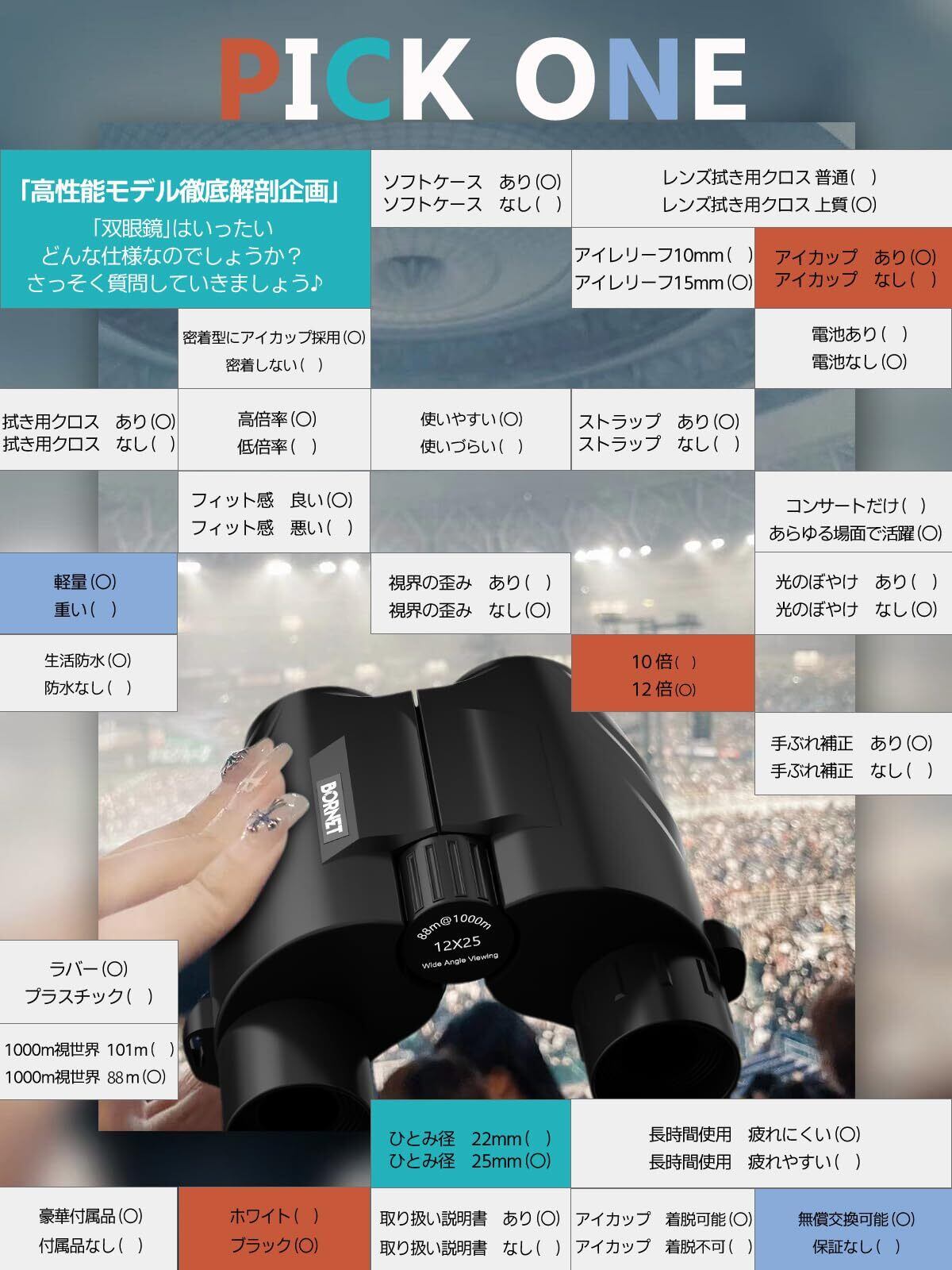 ■【圧倒的な視界を楽しめる12倍倍率!】Bornetの双眼鏡は、12倍の倍率を実現し、ライブやコンサート、スポーツ観戦、さらにはバードウォッチングなど、幅広いシーンでの使用に最適です。25mmのレンズ径が大きく、明るくクリアな視界を提供。大迫力のパフォーマンスをしっかりと見届けることができます!