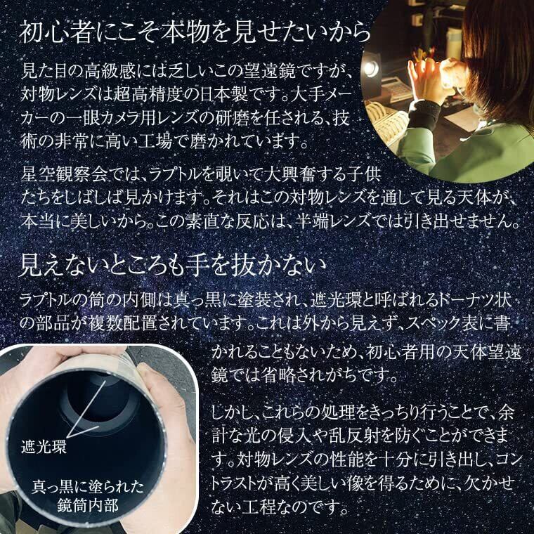 【「スコープテック」「ラプトル」等で検索してみてください】 数々のHPやブログで理想的な入門機として紹介されいます。初心者用であるスコープテックの天体望遠鏡ですが、レンズ性能の素晴らしさから、天文愛好家の方々からも高い評価をいただいております。月のクレーターはもちろん、土星の輪や、木星の縞、4つのガリレオ衛星を確認することができます。