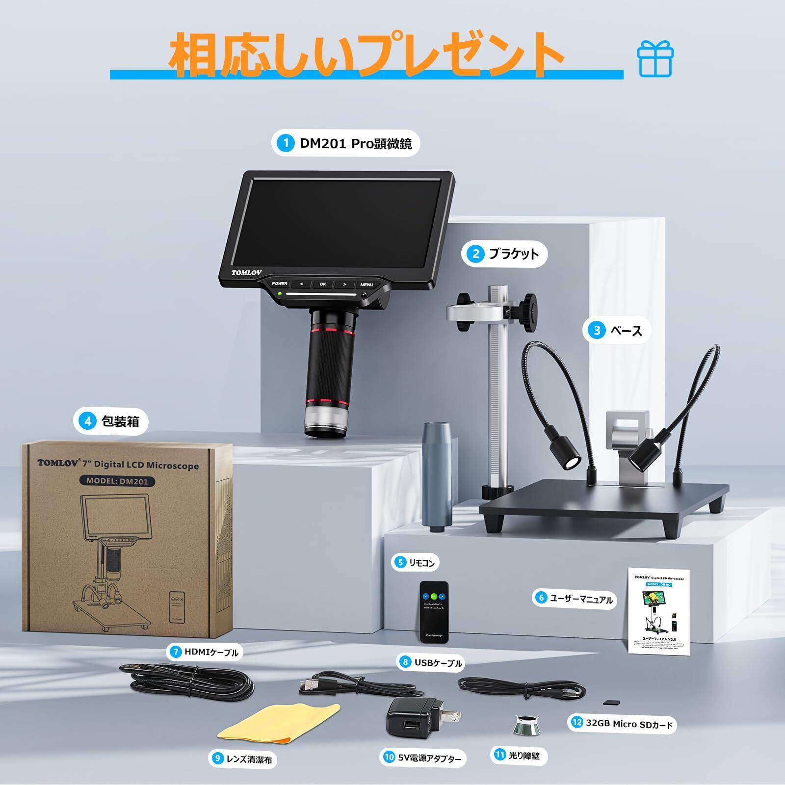 デジタル コイン顕微鏡 TOMLOV AX1300倍率 7インチ HDMI 液晶 ビデオ顕微鏡 8 LEDライト10インチ昇降スタンド PC接続可能 USBマイクロスコープWindows/Mac OS/TV対応 1200X 32GBカード 16MP 回路基板修理 コイン鑑賞 生物観察 日本語対応 DM201 Pro 電子マイクロスコー