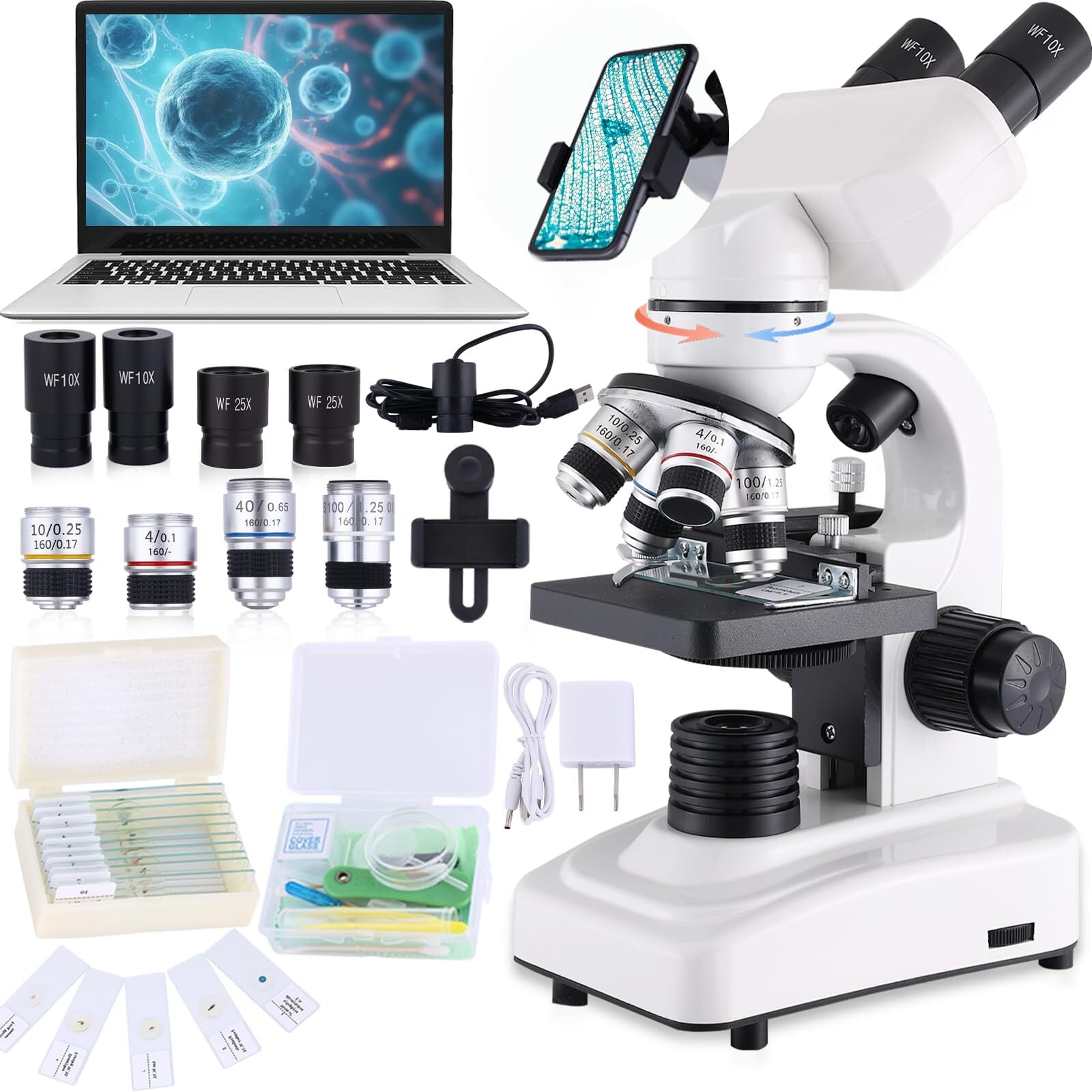Herwicm複合双眼顕微鏡 40X-2000X 極度の拡大、LED の光源が付いている 10X 25X 広角の接眼レンズ、移動ノギスが付いている実体顕微鏡、学生および専門家のための電子カメラ…