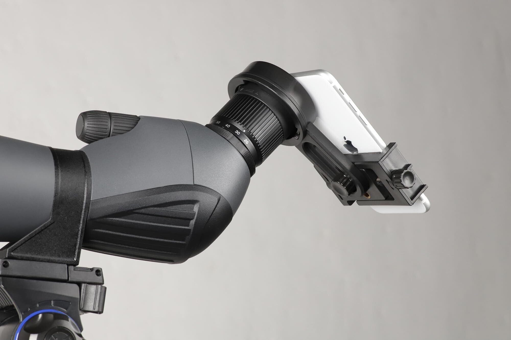 対物レンズのマルチコーティングにより、クリアな視界を提供します。見口は傾斜型なのでアイレベルよりも高い場所に位置する野鳥や天体など観察にぴったりです。また射撃競技などあらゆる場面でお使いいただけます。付属のスマートフォンホルダーの併用でスマートフォンで撮影も可能です。