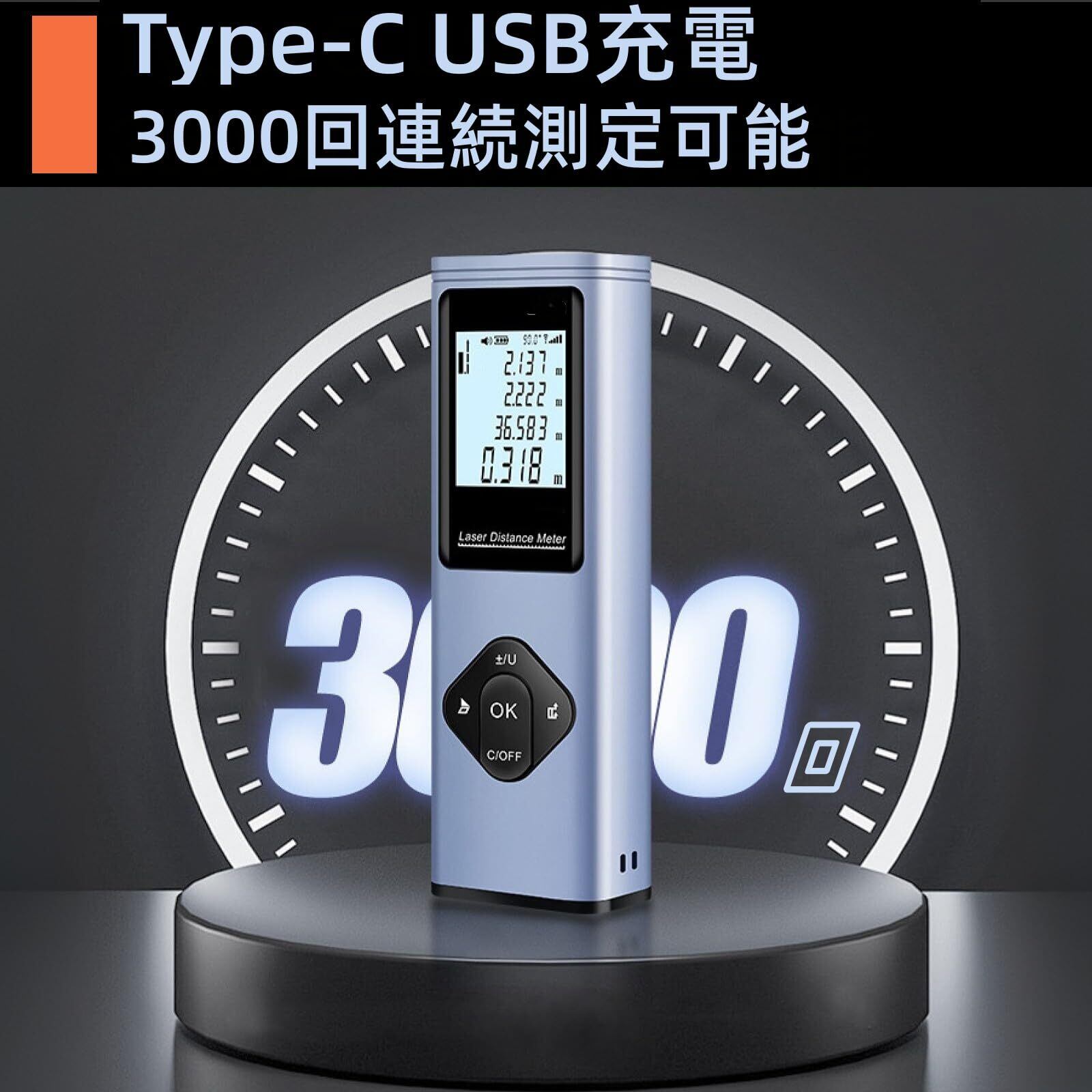 【パッケージ内容】レーザー距離計本体、Type-C充電ケーブル、ストラップ、日本語取扱説明書。