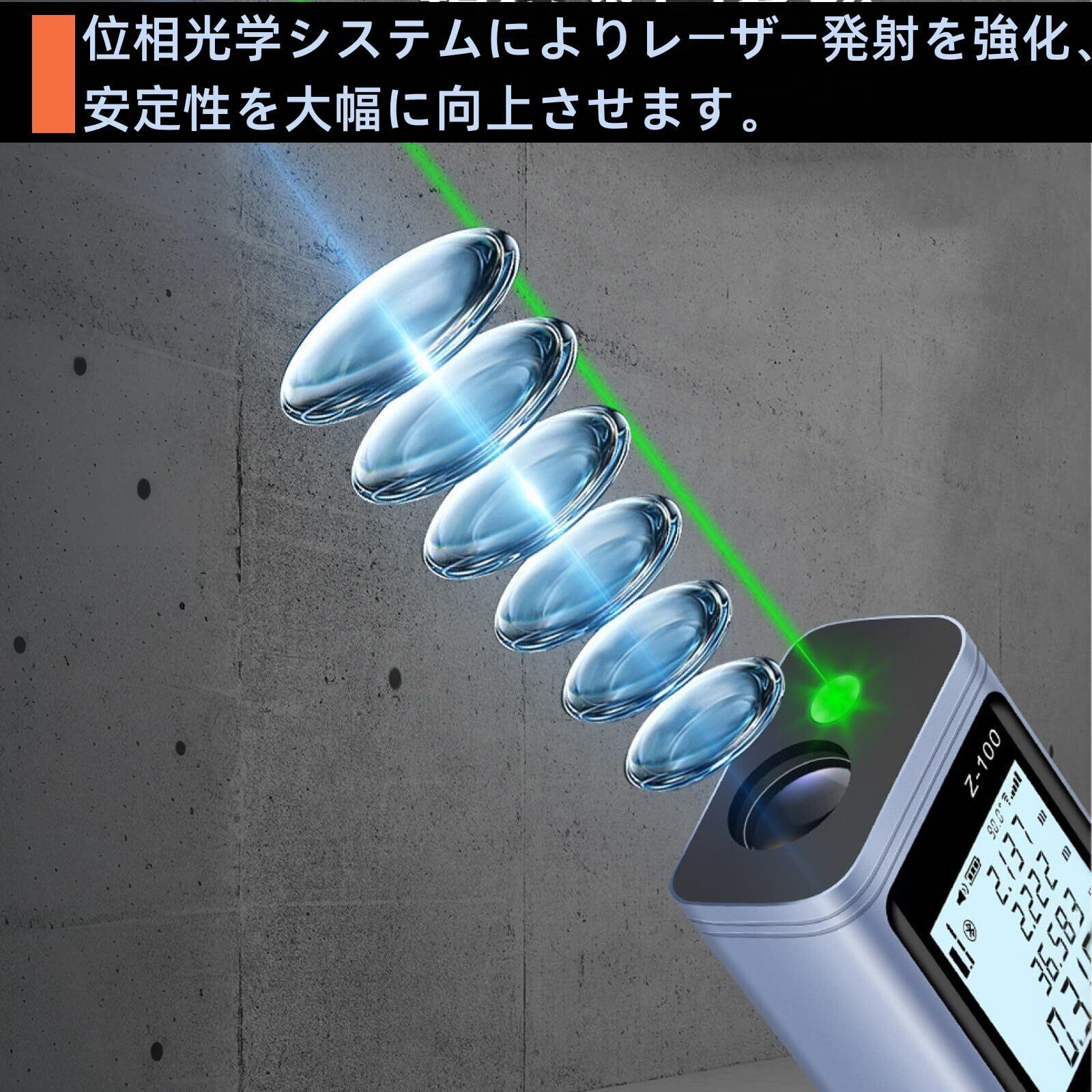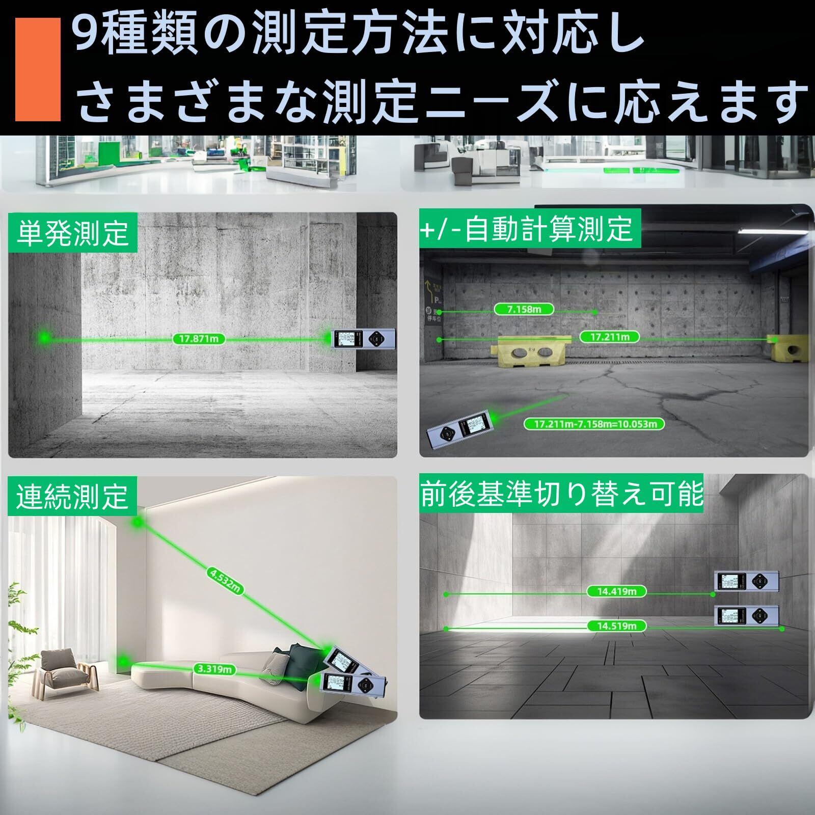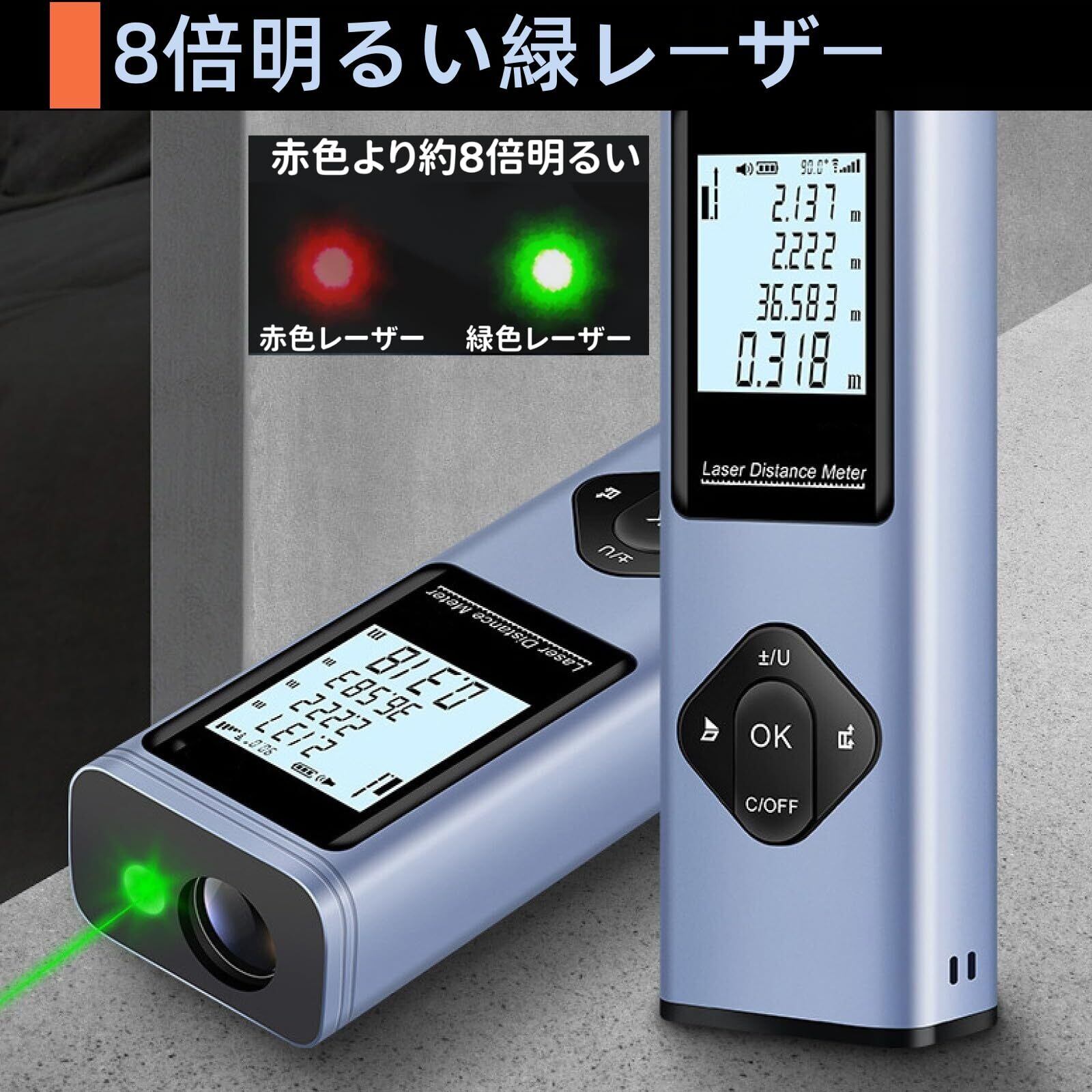 【製品仕様】 緑 レーザー距離計・8倍明るい・レーザークラス:クラス2(532nm、1mW以下)・測定範囲:0.05m~40m ・測定精度:±3mm ・対応測定:距離、面積、体積など