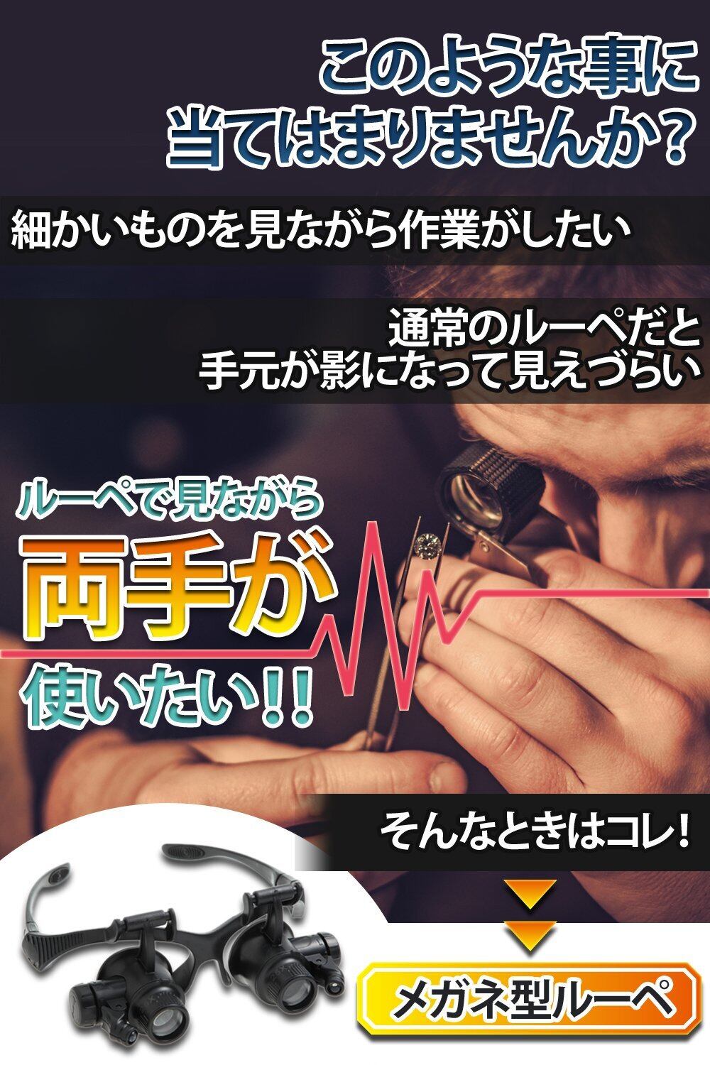 【シーン】細かいものを見ながら作業がしたい、通常のルーペだと手元が影になって見えづらい、ルーペで見ながら両手を使いたい!そんな時にはコレ!メガネ型ルーペ!!ルーペを手に持つわずらわしさから解放されるので、両手が自由に使えるから細かい作業も楽々。軽くて目にかけて圧迫感が少なく、長時間作業も楽々。高照度の2LEDライト搭載なので暗所でも使用可能です!