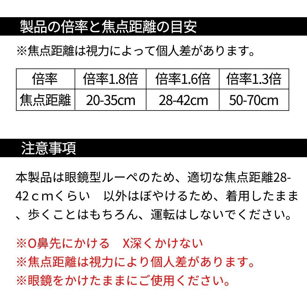 拡大率は1.6倍。ピントが合わない時は対象物との距離をご自分で調整しながらおこなってください。 ルーペメガネの他に付属の商品がたくさん! 高級感のある黒のメガネストラップ、イヤーフック、手軽に使える収納ポーチ、レンズ用クロスがついた合計5点セットです。