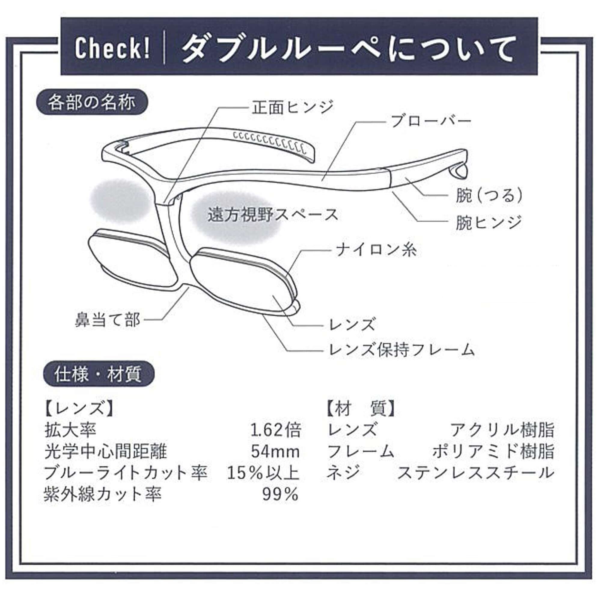 材質:ポリアミド(フレーム)アクリル樹脂(レンズ) サイズ:レンズ幅45・ブリッジ幅9・テンプル長140 ●仕様:拡大率1.62倍、ブルーライトカット率:15%以上、 紫外線カット率:99% ●セット内容:メガネチェーン ×2本、レンズ拭き+ケース ※ケースは収納する際キツい場合がありますが、次第に伸びて馴染み収納しやすくなります 。