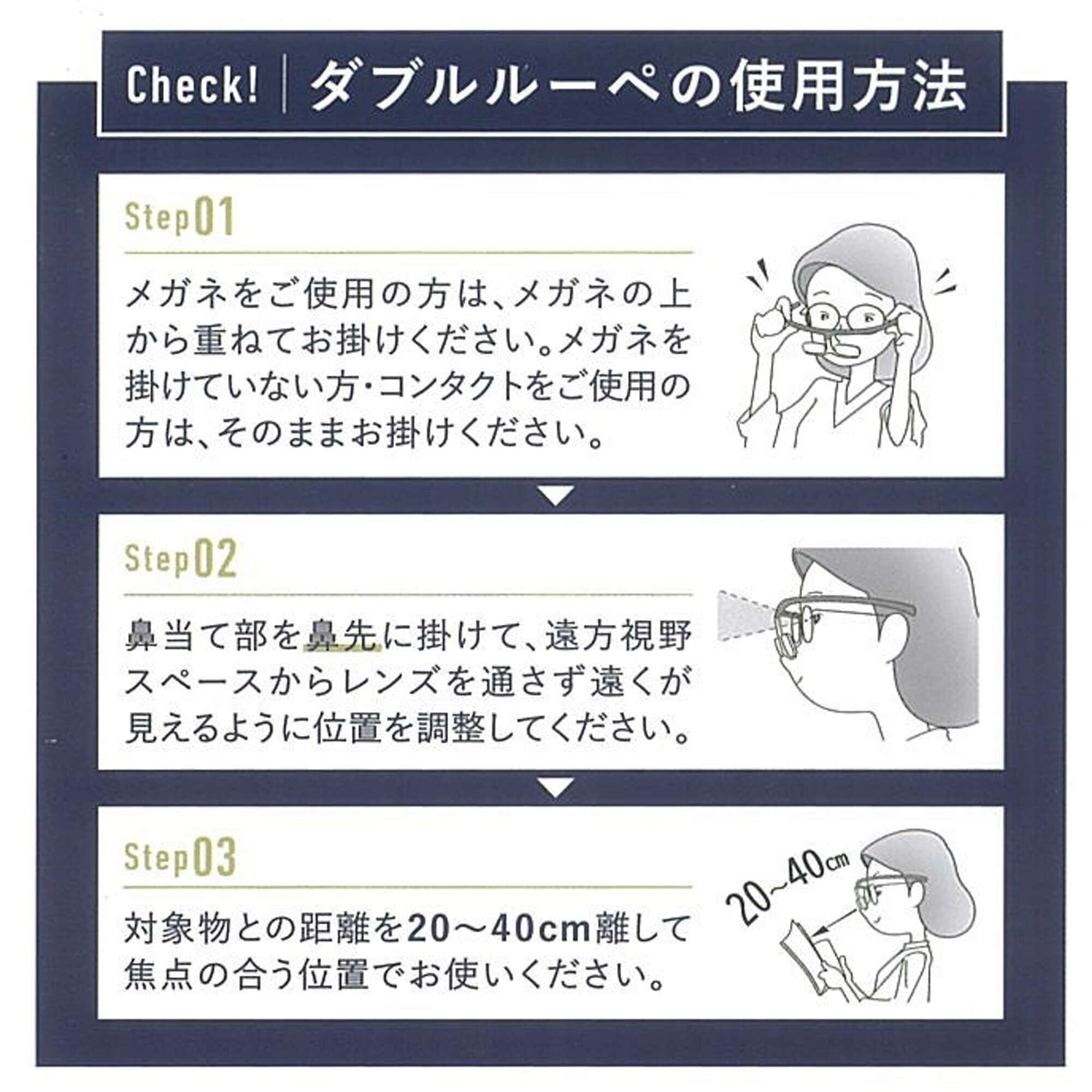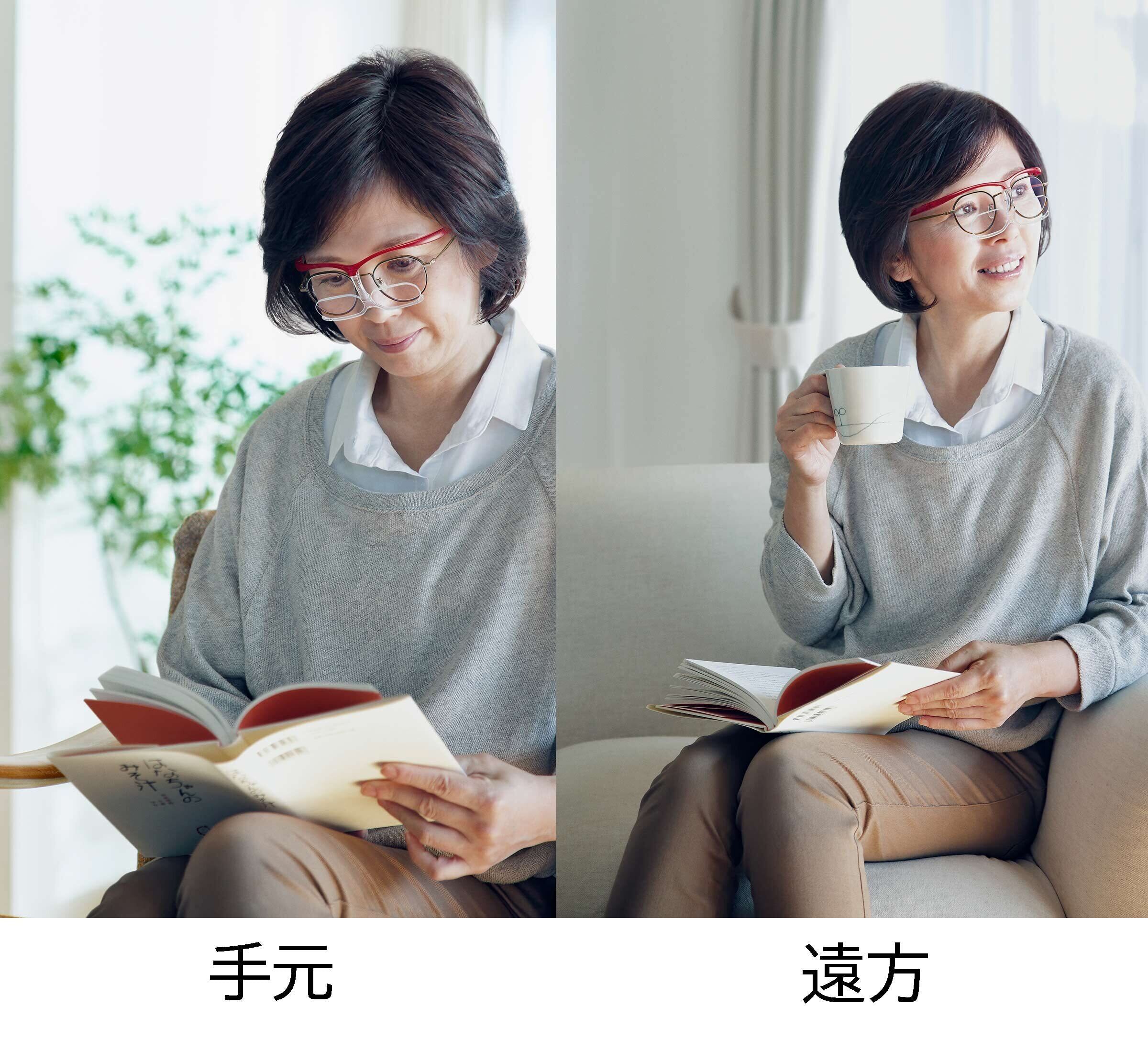 メガネの上から掛けるのに適した形状で、レンズを通して手元を拡大して見ることと、そのまま目線の移動だけで離れたところを見ることができます。掛け外しの手間が省け、常に両手が自由に使えます。