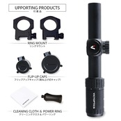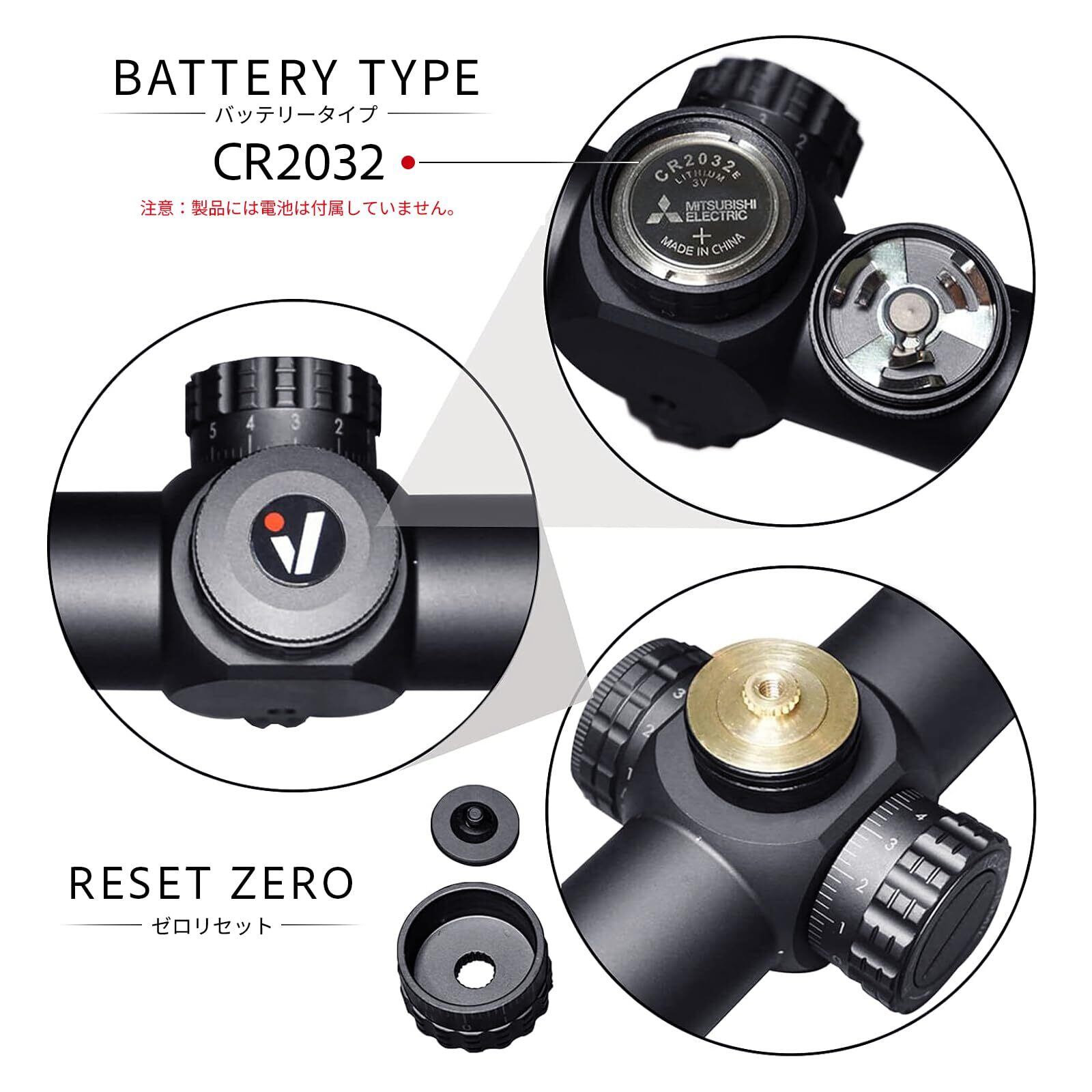 【製品詳細】倍率 1−6× 対物レンズ径 24mm 全長 249mm 重量 425g アイリリーフ 101mm チューブ径 30mm クリック 1クリック=1/2MOA レティクル MIL 赤・緑イルミ CR2032(別売)。