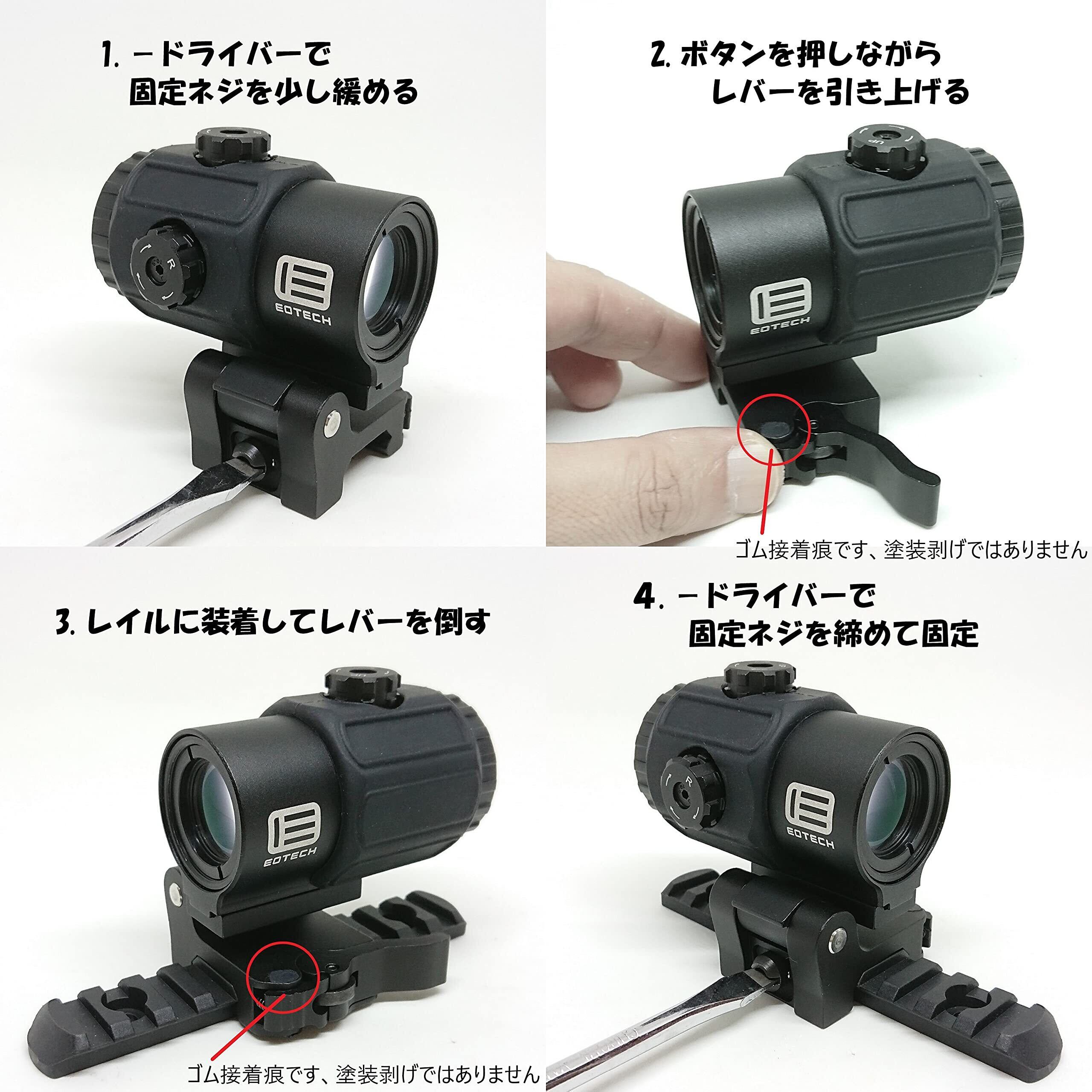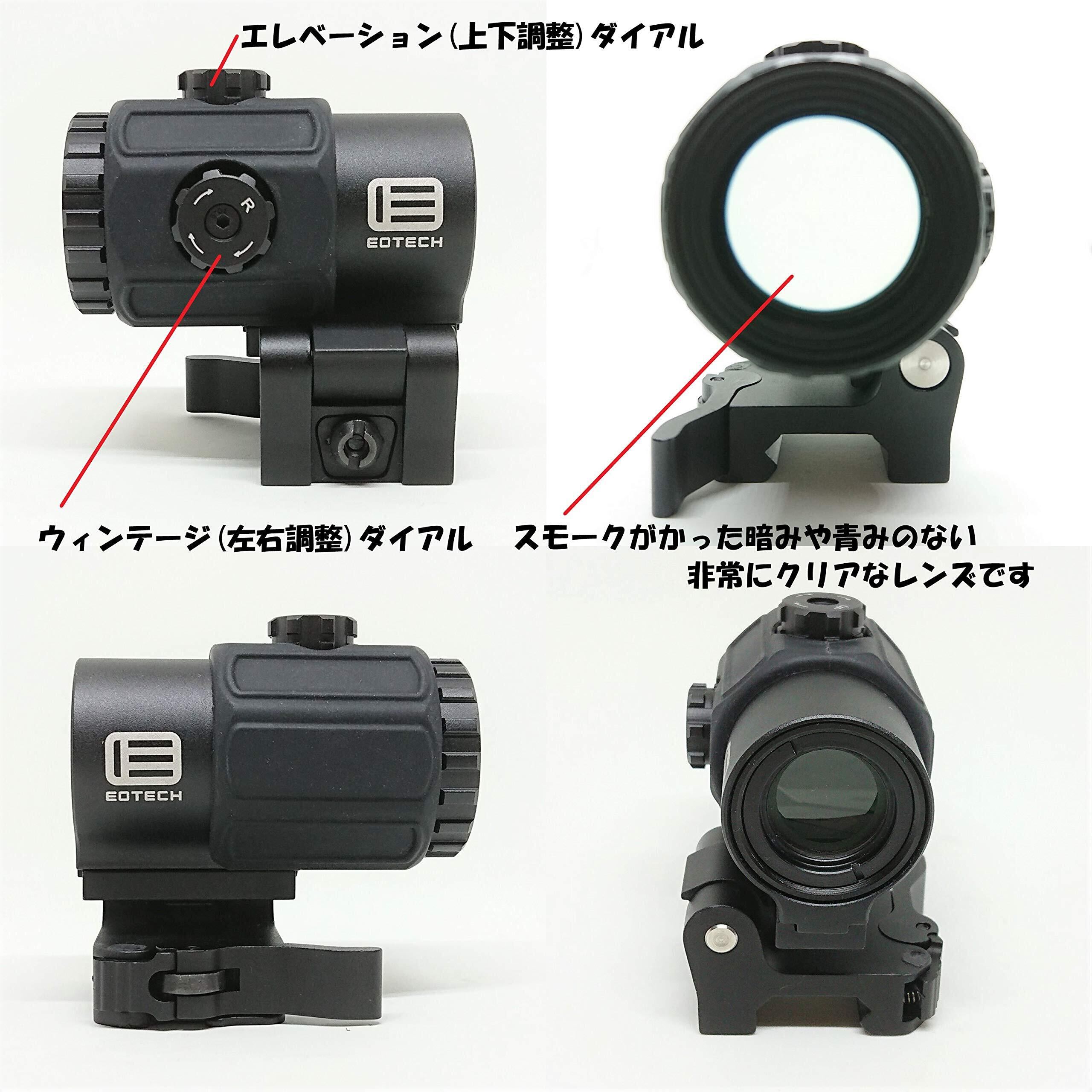 マグニファイアのSTS(Switch-To-Side)マウントにより、90度側面に倒すことで簡単に3倍~1倍への照準の切り替えができ、中射程~短射程のサイティングを素早くスイッチできます。開閉がガッチリしているため、ガタつきがなくしっかり狙えます。 G33モデルと比較して小型化・軽量化・アイレリーフが延長されました。 レティクル調整はブースター本体上部(上下調整)、側部(左右調整)にあるダイヤルで直接調整ができます。