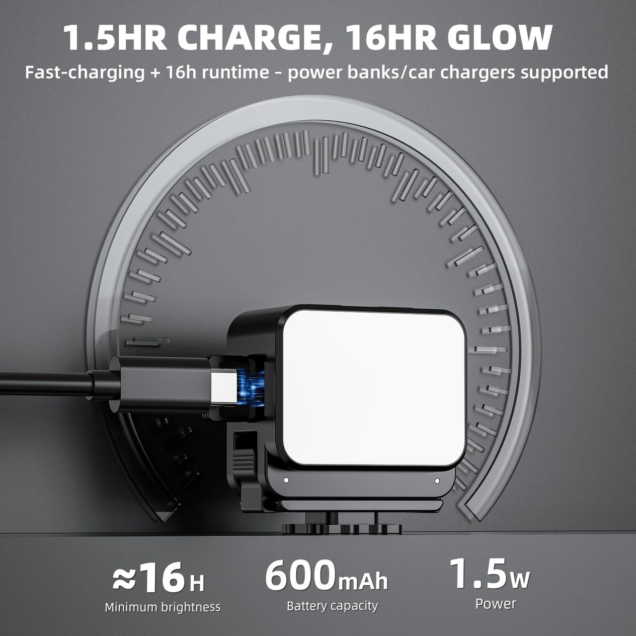 長時間駆動で撮影を中断しない - 600mAh大容量バッテリー搭載:最大輝度1.5時間~最小輝度24時間連続使用可能。付属ケーブルで約1.15時間の急速充電を実現。