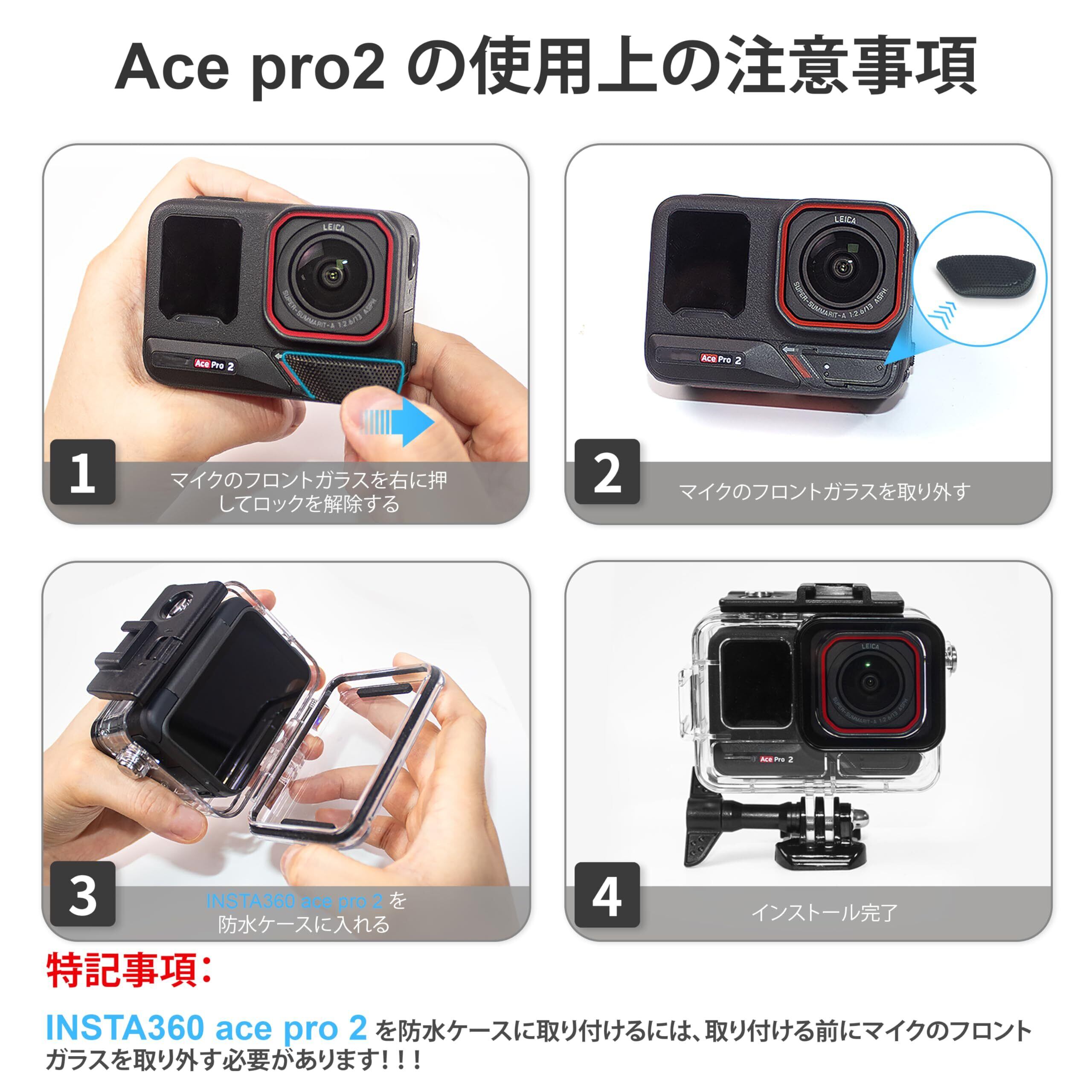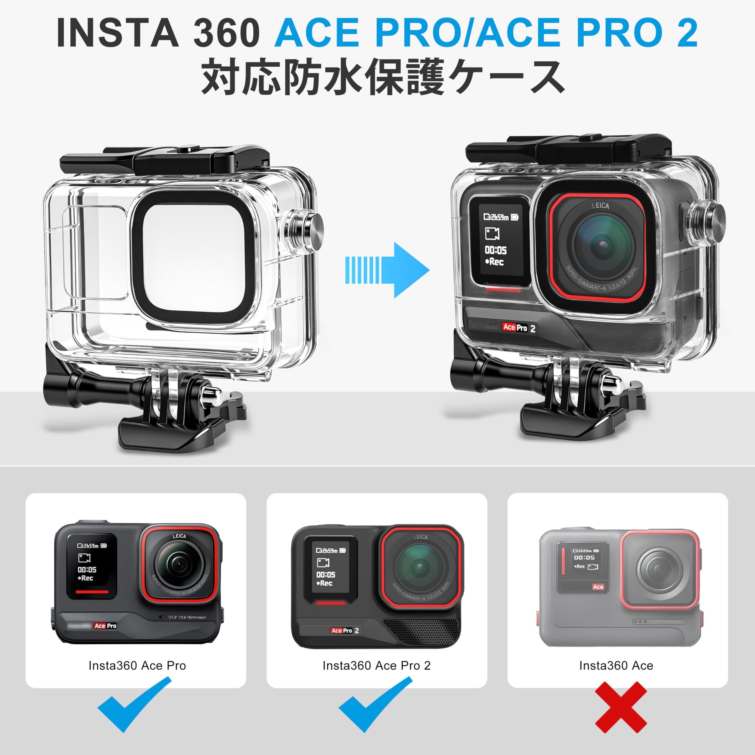 【Insta 360 Ace Pro 2/Ace Pro ダイビングケース】この防水ケースはInsta 360 Ace Pro 2/Ace Pro専用に設計されており、傷、衝撃、ほこりから最大限に保護します。重要:INSTA 360 Ace Pro 2の場合、防水ケースを装着して使用する前に、取り外し可能なマイクウィンドスクリーンを取り外す必要があります。