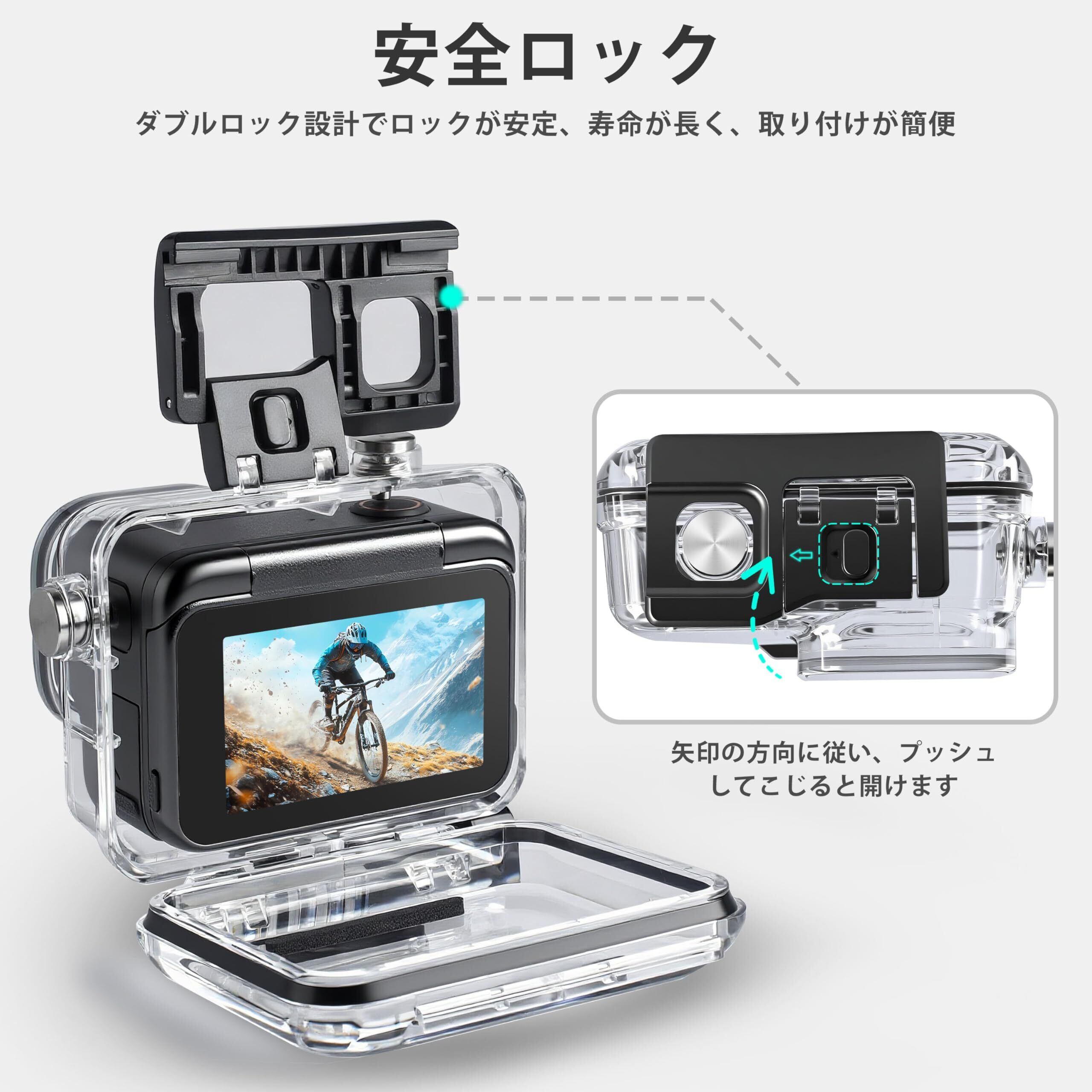 【パッケージ内容】防水ハウジング1個、防曇フィルム12枚、ネジ1本、アダプターベース1個(ネジとアダプターベースは、防水ハウジングとアクションカメラホルダーを接続するのに役立ち、より良い写真を撮るのに役立ちます)。ご注意:ご購入前に、お使いのカメラモデルとの互換性をご確認ください。