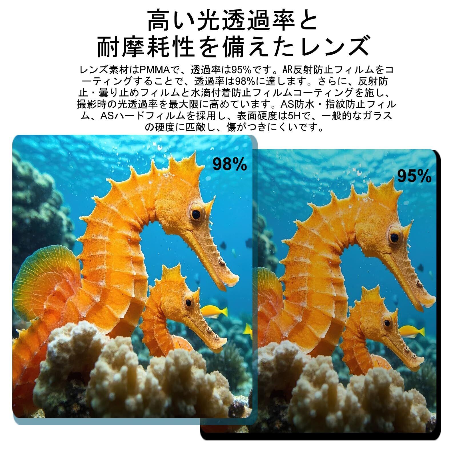 【超クリア光学レンズ】高透明度PMMAレンズにARコーティング(光透過率98%)と防曇・撥水加工を施し、360°の鮮明な水中映像を実現します。水中の世界を簡単にコントロールできます。