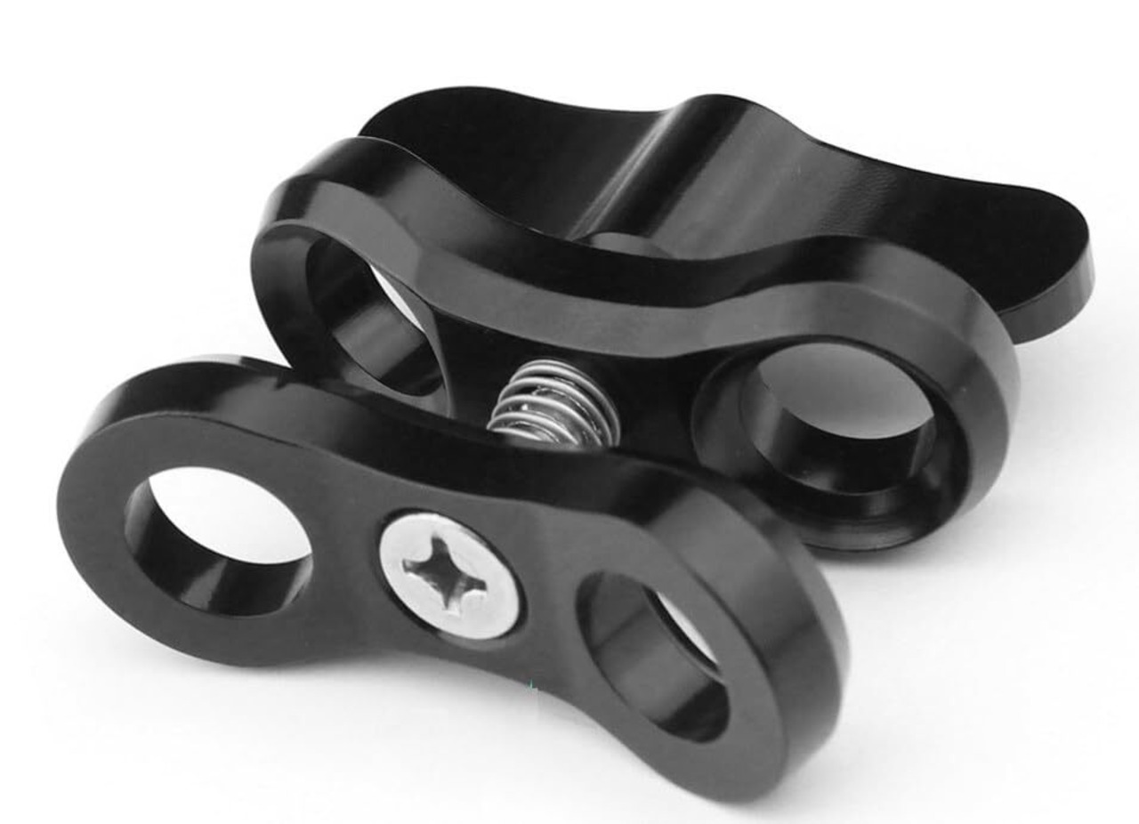 スキューバダイビング等で水中を撮影する際の器材同士を接続するために使用する部品です。アームボール部を持ったアームボディやダイレクトベース、アダプターなどを挟んで接続・固定するクランプです。