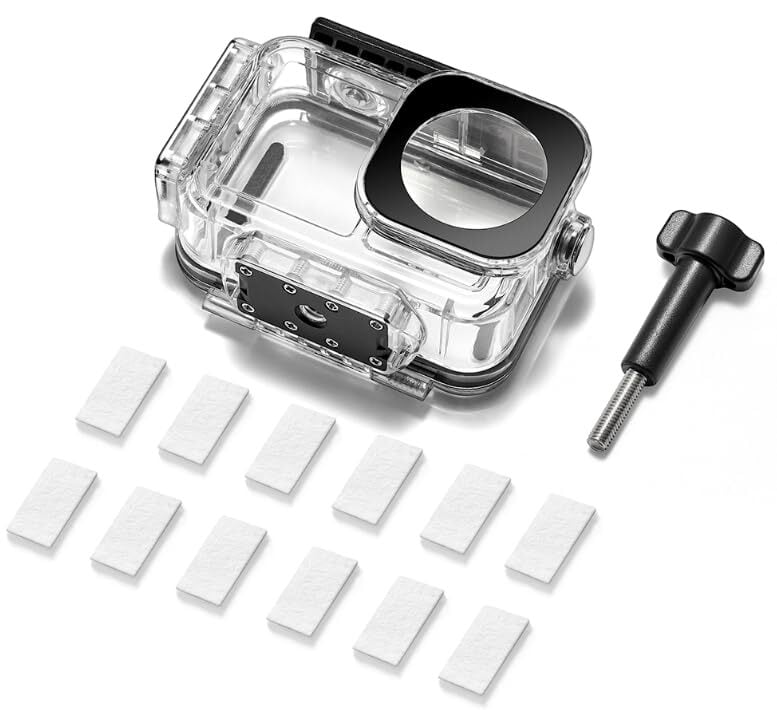 【パッケージ内容 】防水ケースx1、 曇り止めシ-トx12、ロックネジx1 。 ※ご購入前に、お使いのカメラが本製品と互換性があることをご確認ください。( カメラ本体は付属しておりません)