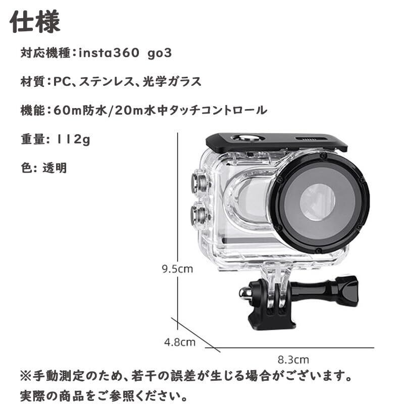 互換性:insta360 Go3 / Insta360 GO 3S用に設計されています.注意:注:insta360Go3Sに防水ケースを取り付ける場合、取り付け前に保護ミラーを取り外す必要があります。ビデオを参照してください。パッケージ内容:防水ケース*1 タッチスクリーンバックカバー*1 見えないベース*1 ネジ*1 説明書*1 曇り止めシート*1 アルコール綿*2、カメラやその他のアクセサリーは含まれていません、当社の製品についてご質問がある場合は、お気軽にお問い合わせください。