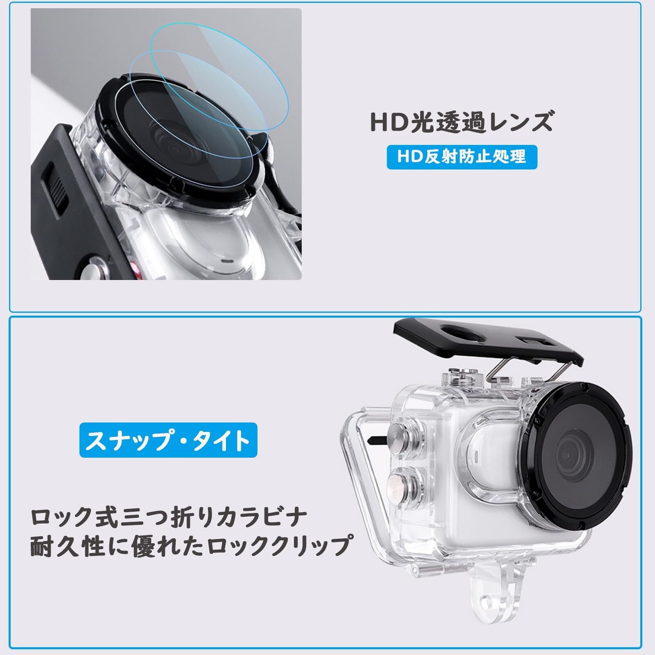 ■【透明度の高い素材!】ケース前面には高透明度の素材を使用しており、水中でもクリアな視界を確保します。撮影時の色彩を鮮やかに再現し、素晴らしい映像を提供しますので、クオリティを妥協することはありません。
