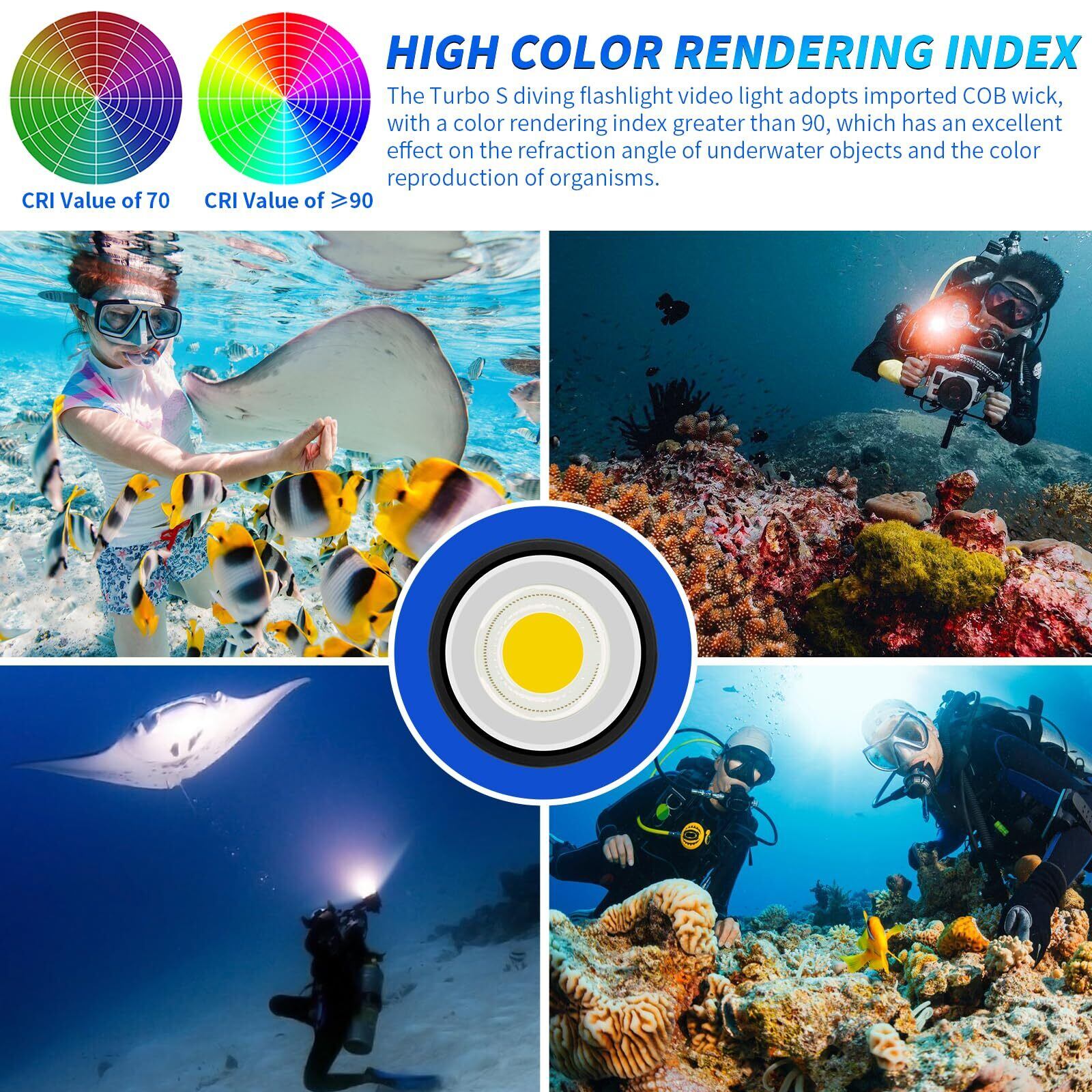 ターボSダイビングトーチビデオライトは、インポートされたCOBウィックを使用して、明るさ10000ルーメン、白色光、赤色光、青色光3色光、5500k-6000kの間の白色光の色温度、トーチの色温度のこの範囲は、正午12時の太陽に非常に近い、水中物体の屈折角、生き物の色の再現、効果は優れています。 もし海水の水質が比較的良ければ、ターボSダイブフィルライトは水中撮影のニーズを満たすことができます
