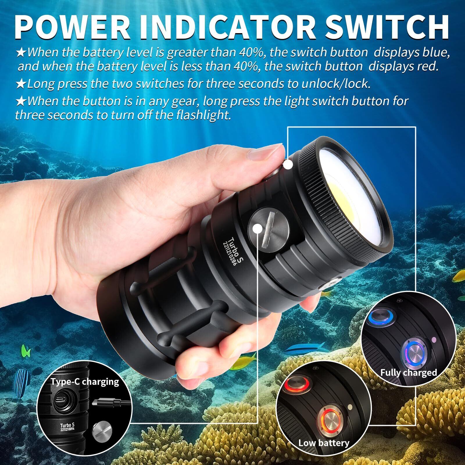 長時間バッテリー駆動:Turbo Sは低光量で15時間、高光量で3時間持続し、Type-cポートで充電することで、長時間の水中活動をサポートします。 電池の残量が一目でわかるデュアルLEDインジケーターデザインを採用